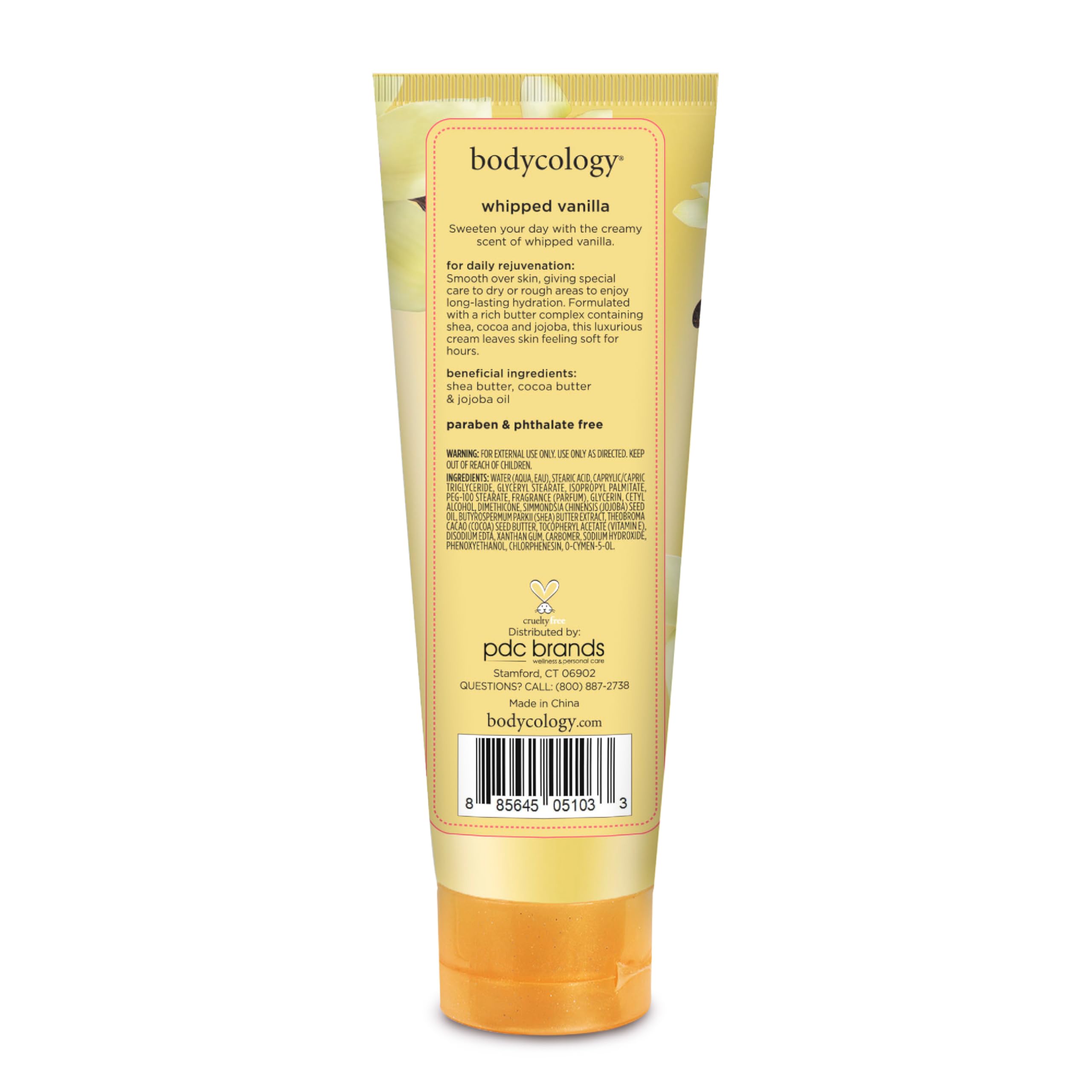 Say bye to dry, and take your get-ready routine to the next level with decadent and luscious vanilla blossom, sandalwood, and gardenia when you moisturize with Bodycology Whipped Vanilla Shea Butter Body Cream. Your skin will thank you for using our ultra-hydrating and non-greasy formula of shea butter, cocoa butter, and jojoba oil. When you lather your skin in our Whipped Vanilla Body Cream, you’ll surround yourself in a bouquet of floral gardenia and night blooming jasmine along with a warm base of vanilla sugar to round it out. Use this fragranced cream as a form of special self-care or make it a part of your daily beauty ritual. You can layer this scent with the Bodycology beauty products you love like the matching Whipped Vanilla Fragrance Body Mist or with our other body sprays to create your own signature scent. All Bodycology products are paraben, phthalate, and cruelty-free.