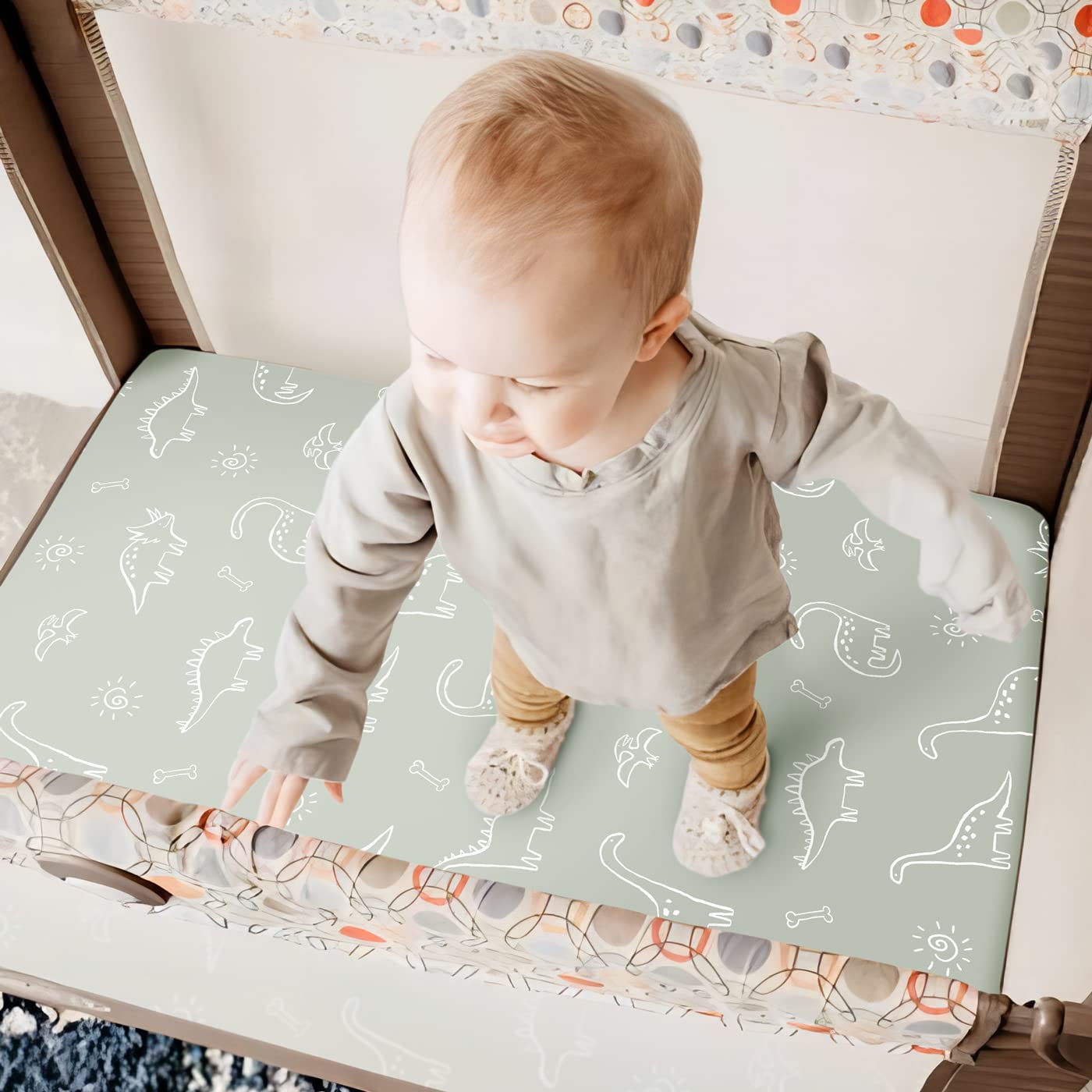 Apple It Within Seconds: Thanks to the elastic bottom, our playard sheets come in a classic, stylish dinosaur creative painting pattern that will put the finishing touches to any bedding. Make sure to give your darling a serene and calm bed to rest in.