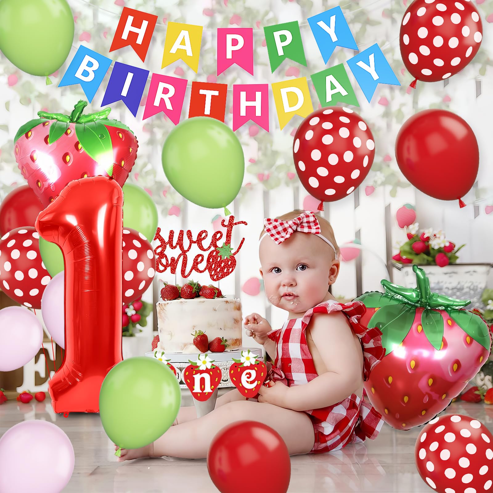 Premium Quality Materials : The red white dot pink green strawberry 1st birthday balloons decorations set made of safe material. These aluminum foil balloons can only fill about 90% of the gas. It can last for a long time after being filled with air or helium, and is not easy to burst. They are non-toxic secure and enjoyable celebration.