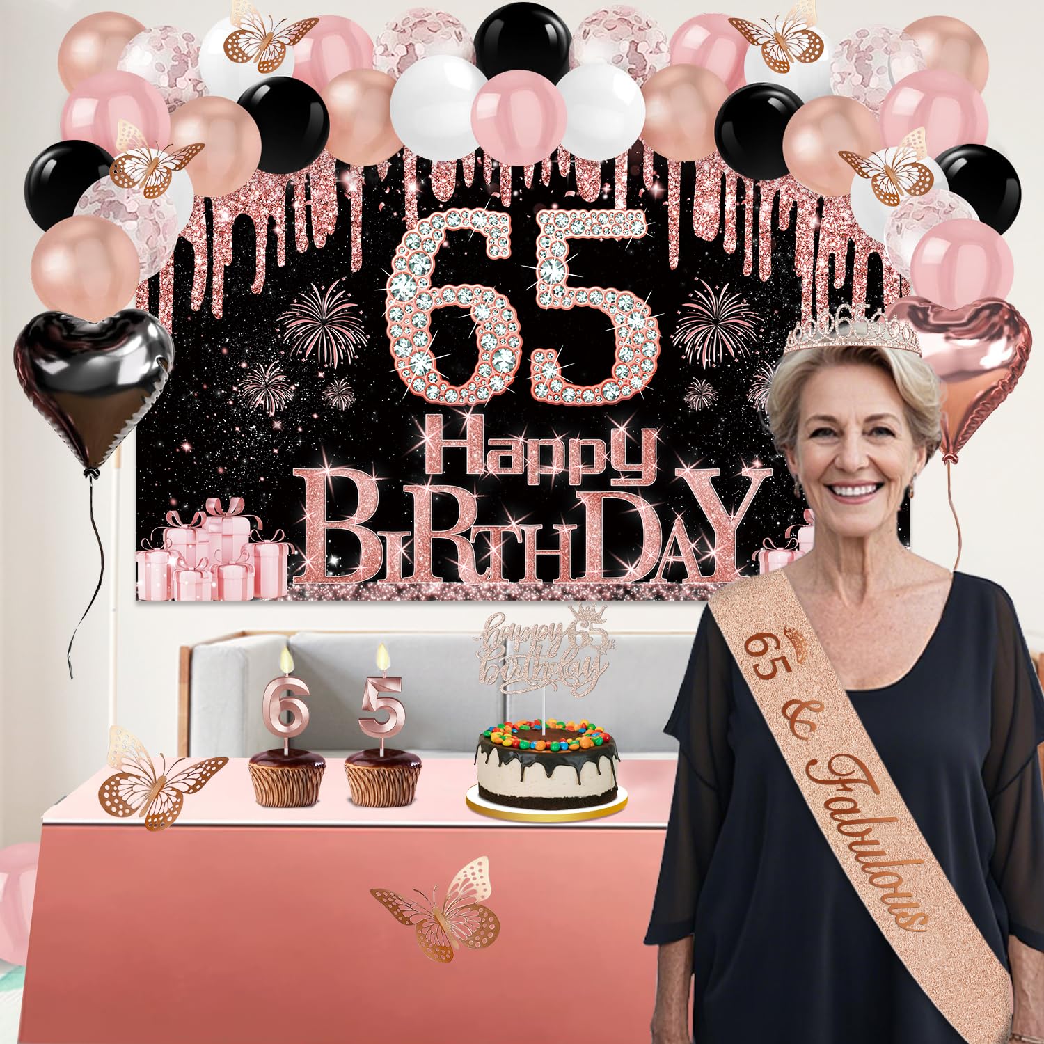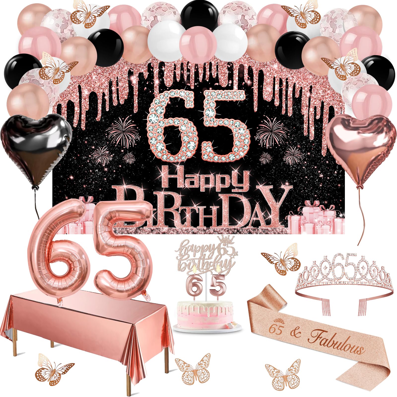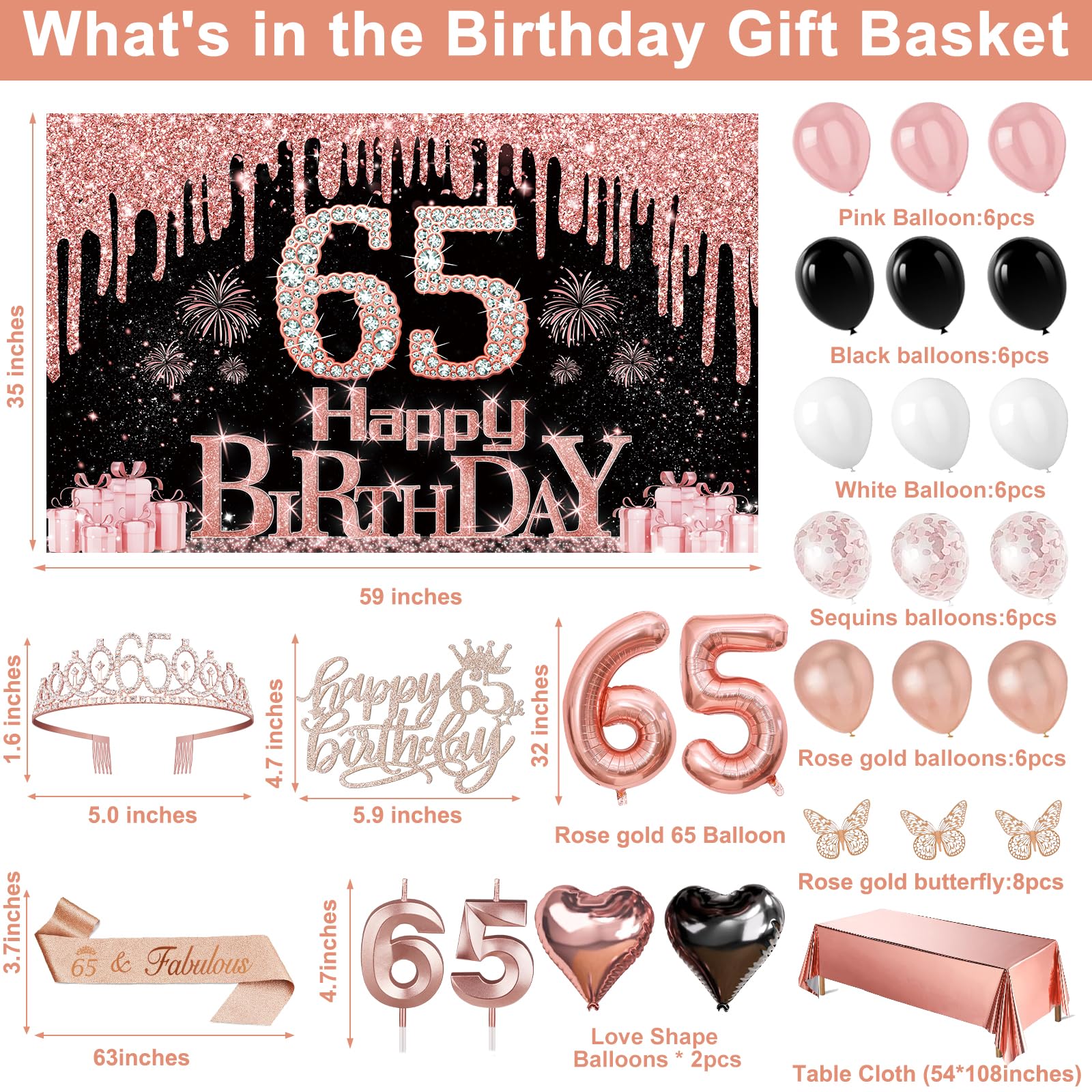65th Birthday Decorations: Package coming with 65th Birthday Banner *1pc, 65th Birthday Tiara *1pc, 65th Birthday Sash *1pc, 65th Birthday Cake Topper *1pc, 65th Birthday Candles *1set, Rose Gold Butterflies *8pcs, Number 65th Birthday Balloons *1set, Love-Shape Balloons *2pcs, Latex Balloons * 30pcs, and Rose Gold Tablecloth *1pc. This complete 49pcs 65th birthday party decoration pack is the best way to meet different decorating needs