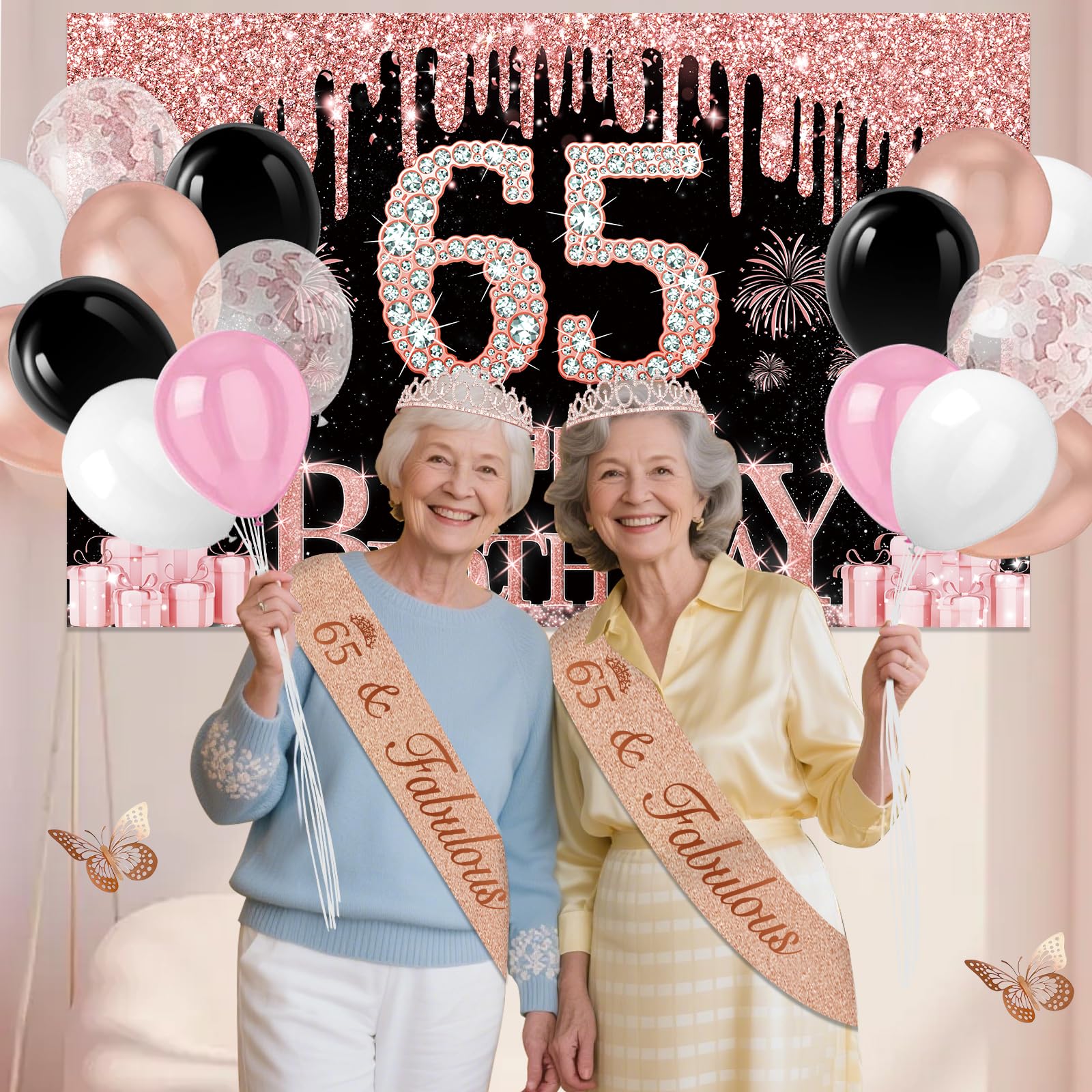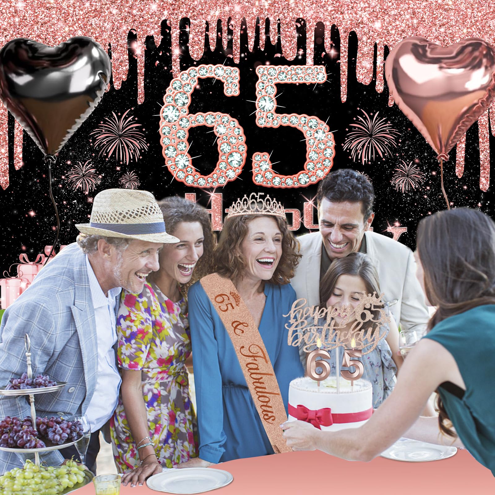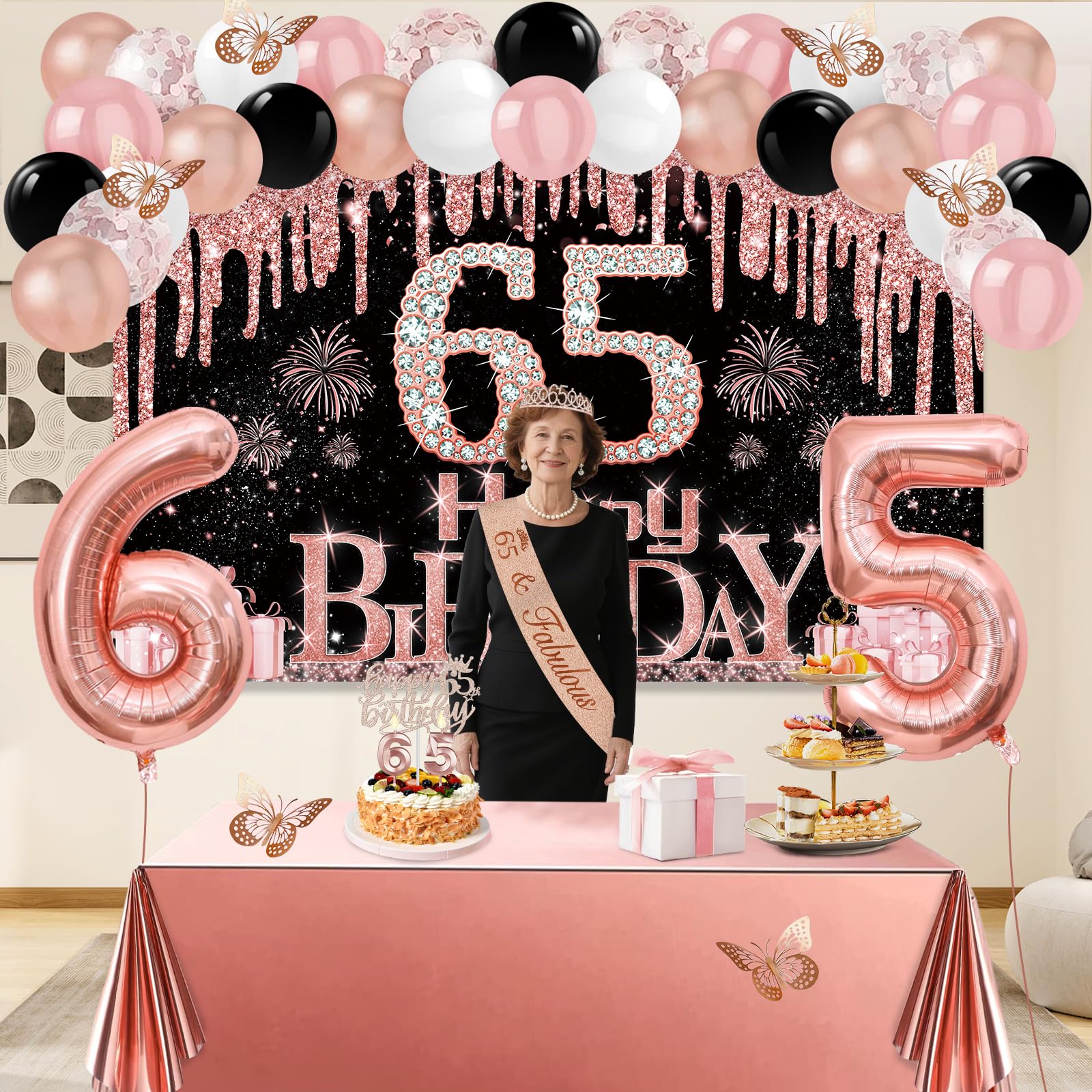 65th Birthday Decorations: Package coming with 65th Birthday Banner *1pc, 65th Birthday Tiara *1pc, 65th Birthday Sash *1pc, 65th Birthday Cake Topper *1pc, 65th Birthday Candles *1set, Rose Gold Butterflies *8pcs, Number 65th Birthday Balloons *1set, Love-Shape Balloons *2pcs, Latex Balloons * 30pcs, and Rose Gold Tablecloth *1pc. This complete 49pcs 65th birthday party decoration pack is the best way to meet different decorating needs