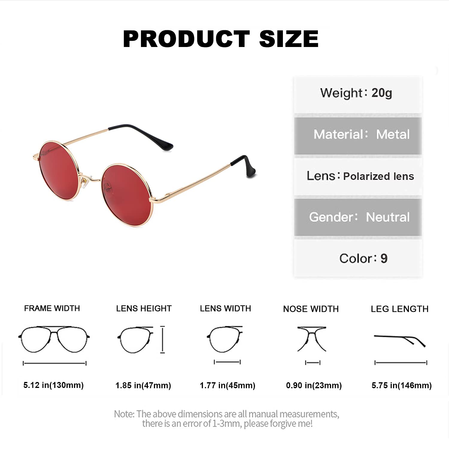 ☀PRODUCT SIZE: Lens Width: 45mm, Frame Height: 47mm, Nose Bridge: 23mm, Frame Width: 130mm, Temple Length: 146mm, Net Weight: 20g.