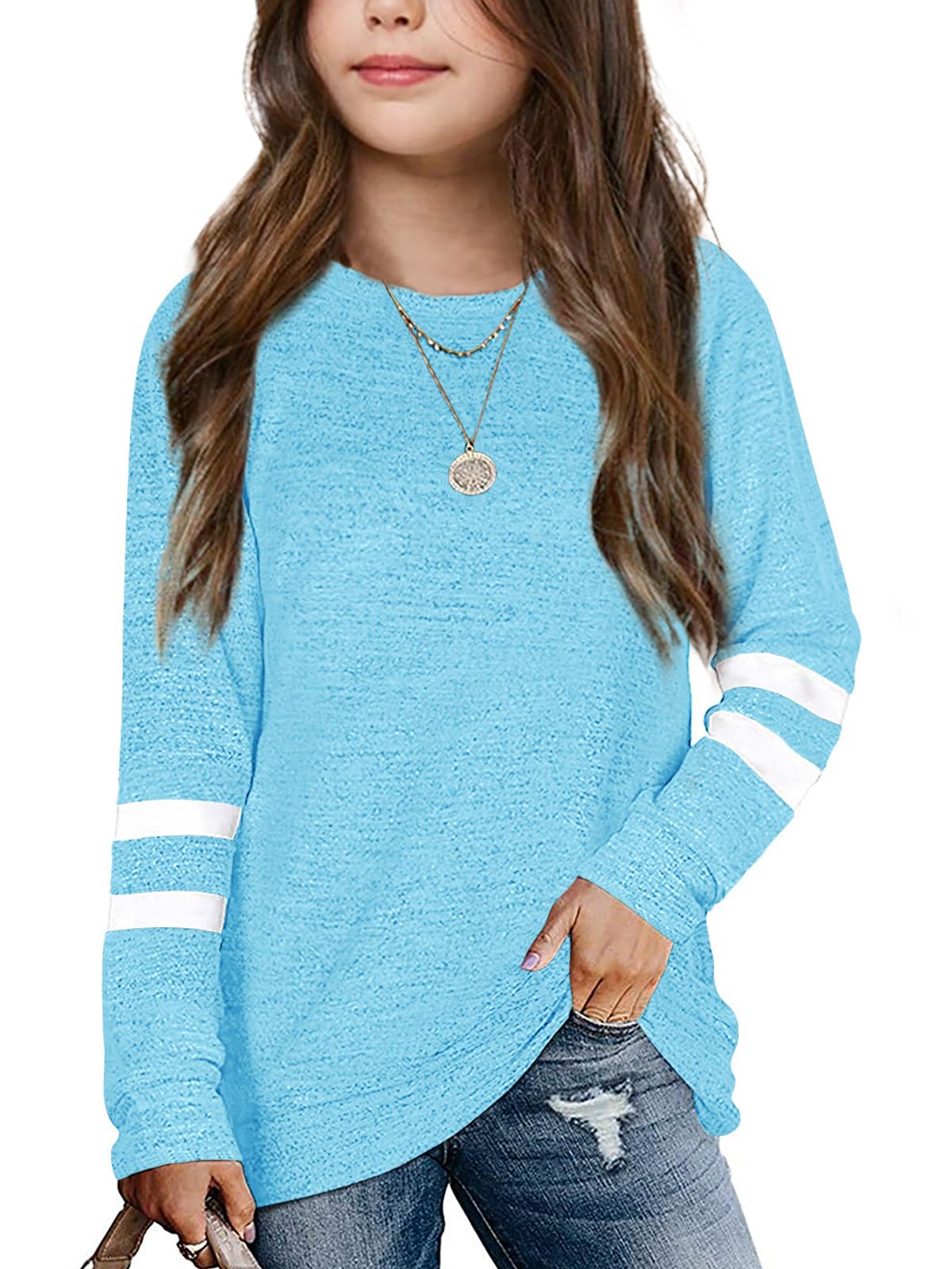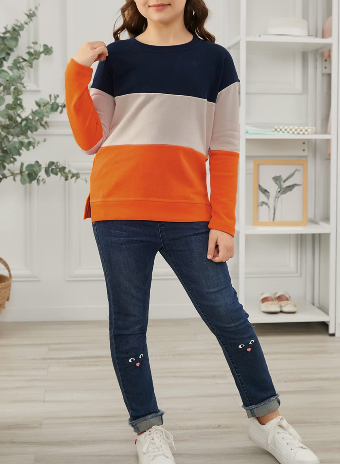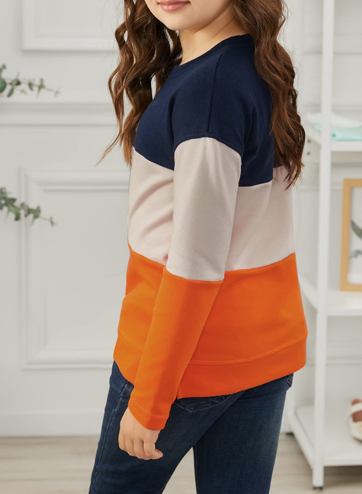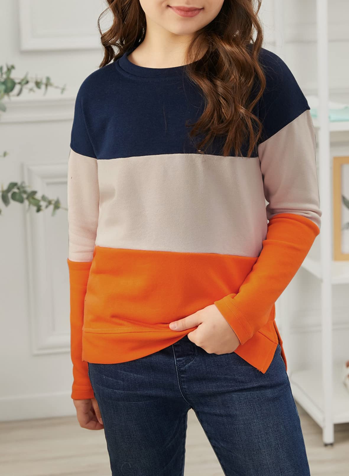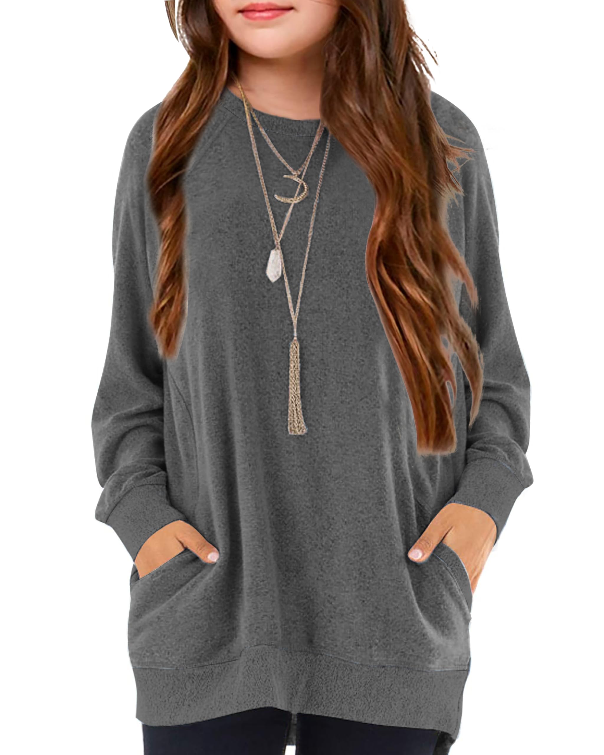 ♥ [Style]:The girls crew neck top with the regular fit can better suit your girl and modify your girl's shape.The top with side pockets is stylish and special for girls. Easy to pair with leggings and skirts