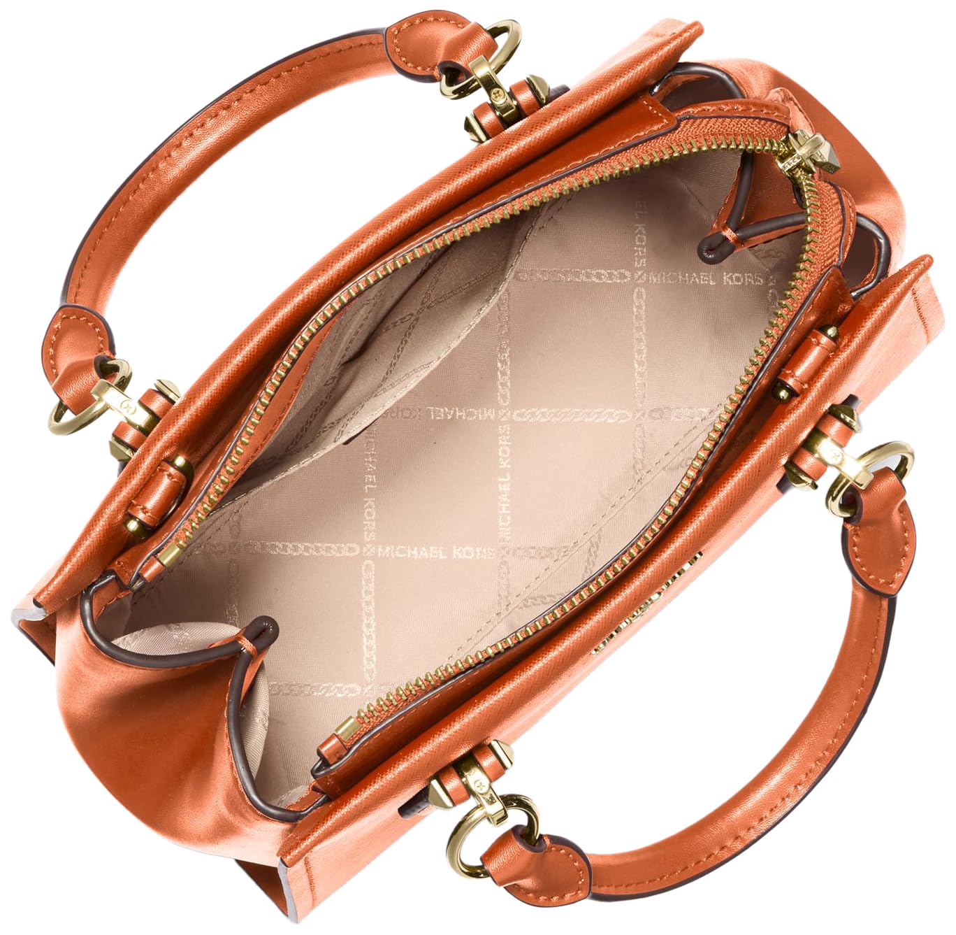 Materials: Crafted from Saffiano leather with gold-tone hardware Our Leather: 100% of the leather in this product comes from tanneries receiving Leather Working Group Gold- or Silver-certification in recognition of their environmental performance Attention to Details: Interior back and front zip pockets, exterior back and front slip pockets, zip fastening and polyester lining. 9”W X 6.25"H X 4.25"D with 3.5" handle drop and optional/adjustable crossbody strap