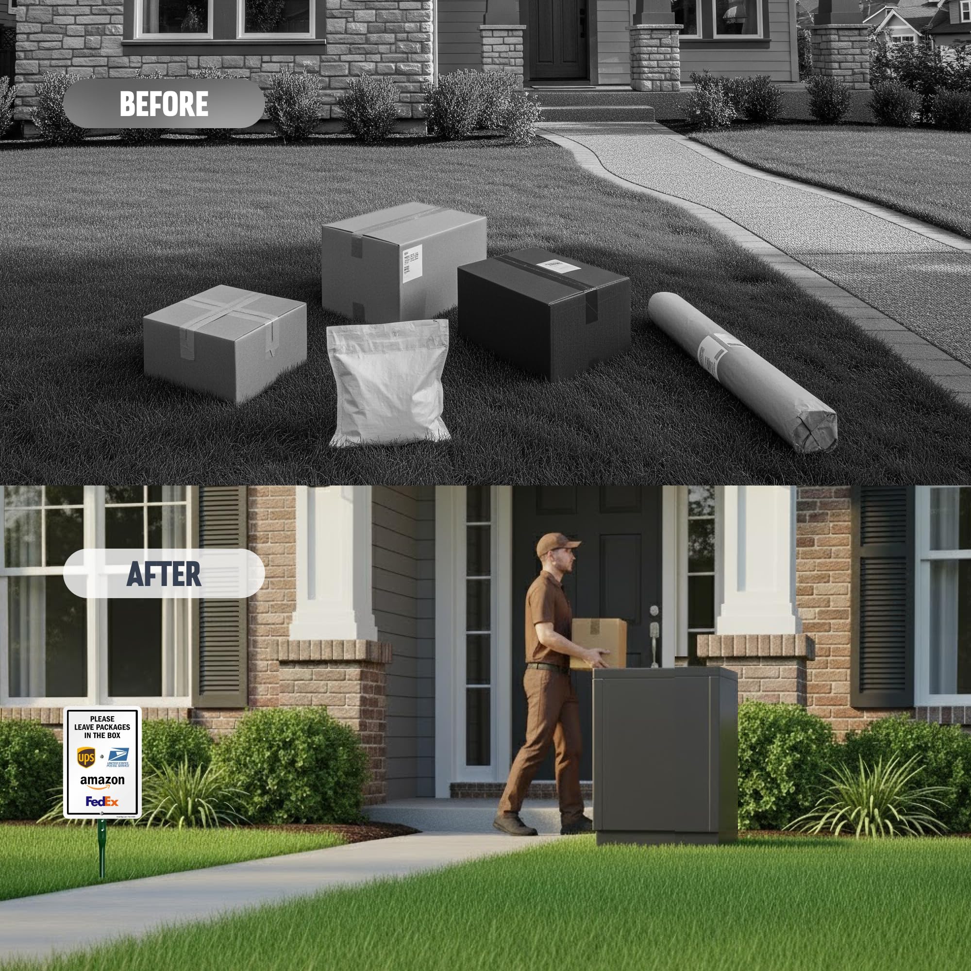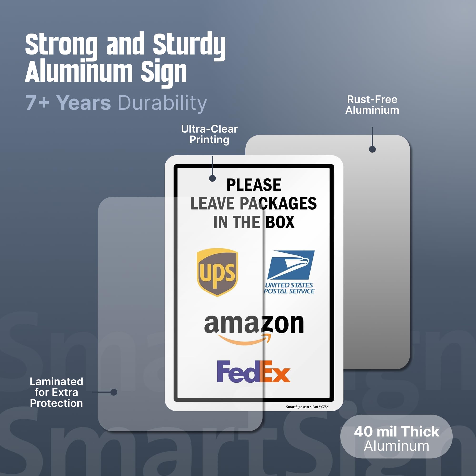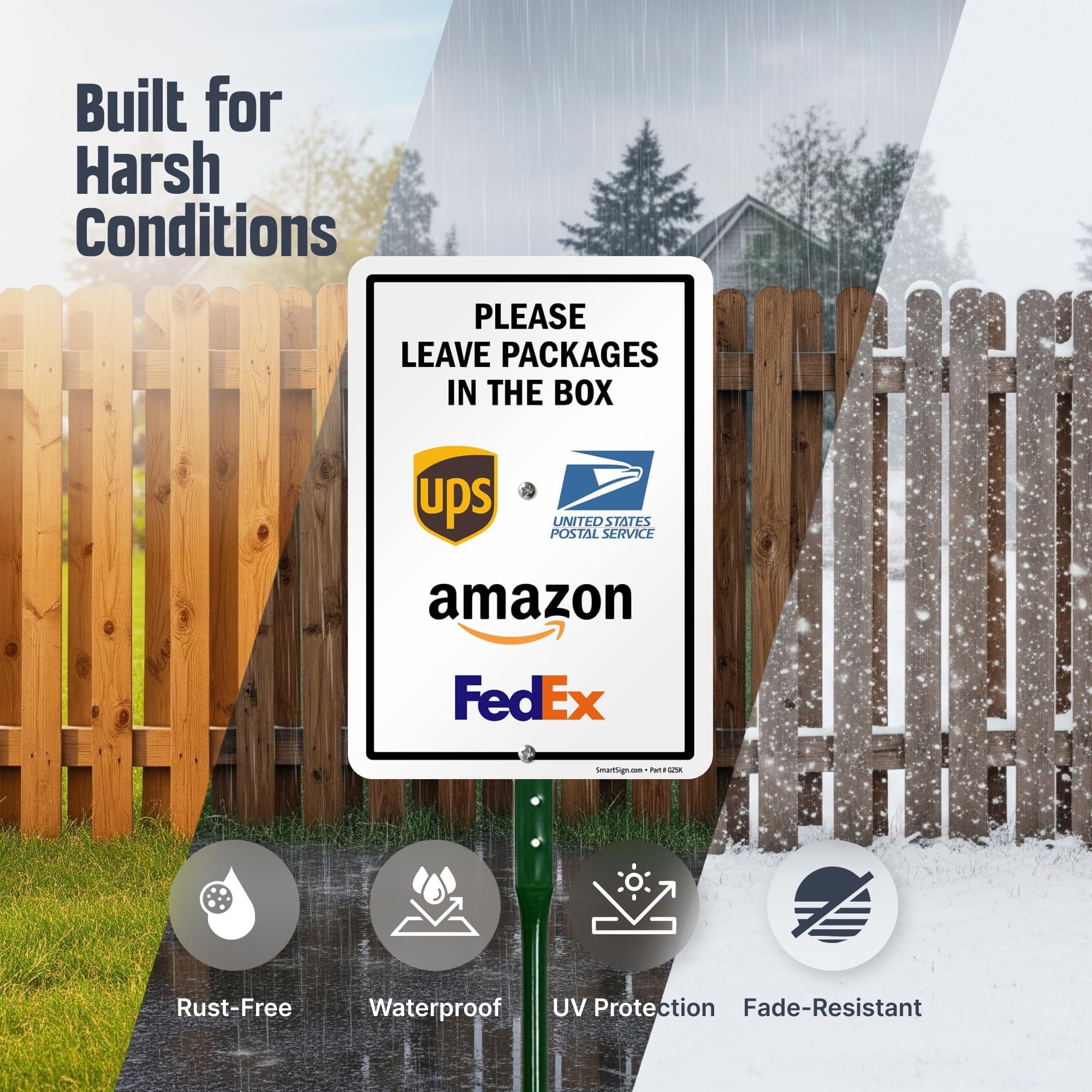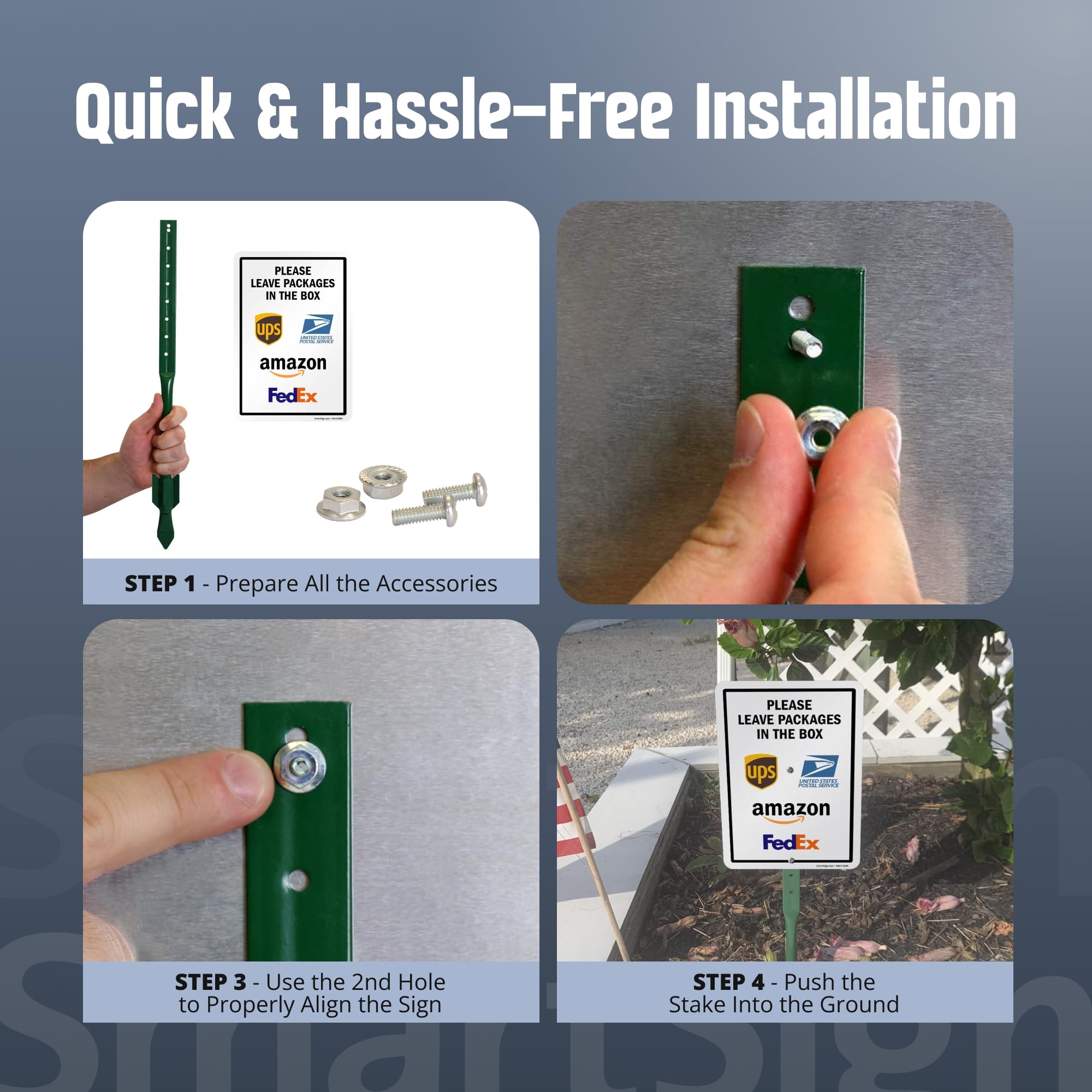 DURABLE: Package Delivery Instructions Yard Sign is made of heavy-duty 40 mil thick aluminum. Sign kit features a bend-proof enamel-coated 18 inch steel stake. The finished sign and stake stands 21.5 inches tall. Aluminum signs outlast plastic signs, which can be torn off more easily. They easily withstand harsh outdoor conditions for years.
