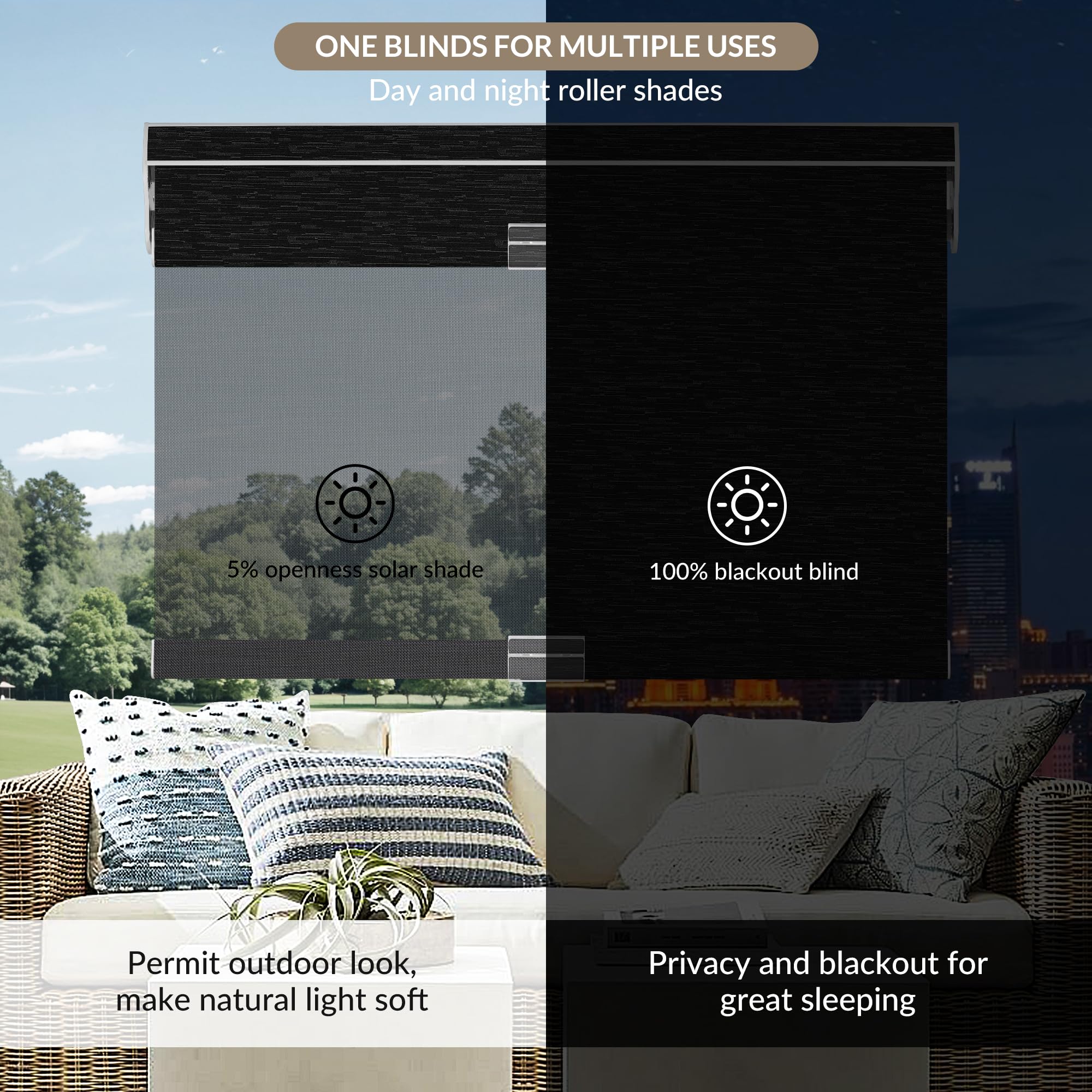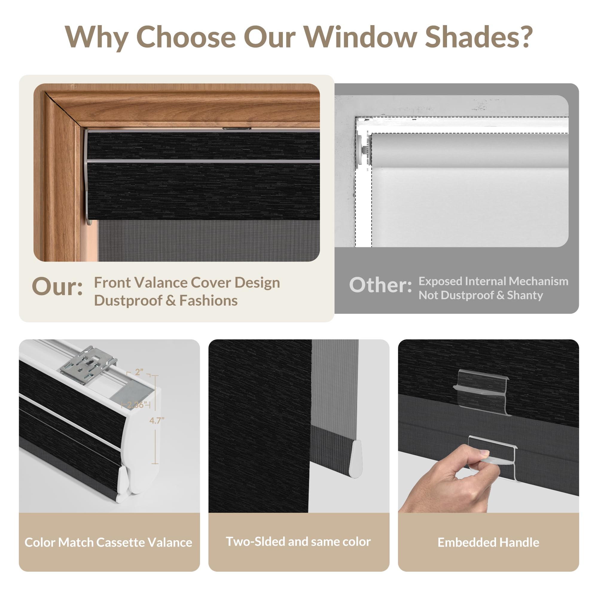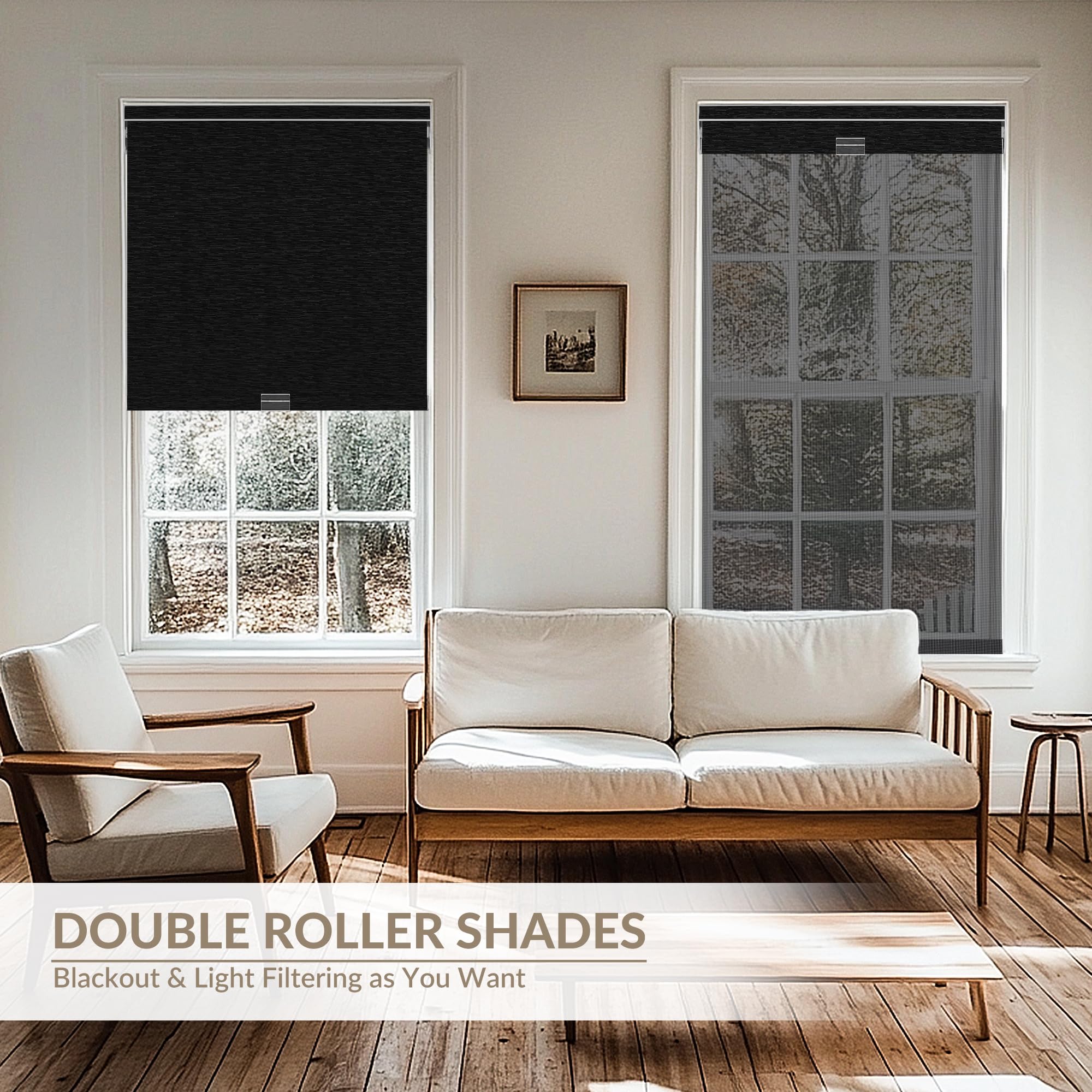 【Update 2 in 1 Dual Roller Shades】 - The cordless double roller shades consists of blackout shades and light filtering shades, blackout shades can provide 100% light blocking, thermal insulation and UV protection; light filtering shades allow the light to filter into your room, and the soft diffused light allows the light and darkness to reach a perfect balance, creating a romantic and comfortable living environment. The perfect combination of function and aesthetics!