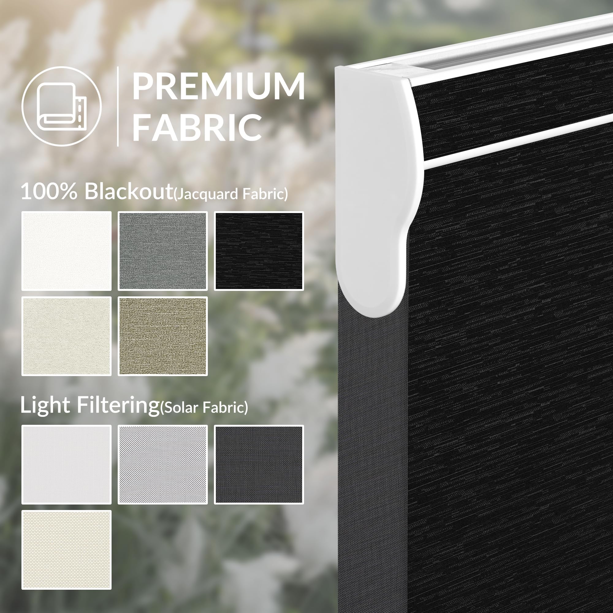 【Natural and Renewable Fabric】 - The front features a new premium linen or jacquard black out roller shades fabric, which blocks sunlight, protects your privacy, and reduces noise. The back side features a luxurious light filtering solar fabric (Hemp Spinning). Both are laser cut and burr free. Ideal for bedrooms, living rooms, bathrooms, kitchens, French doors and offices.
