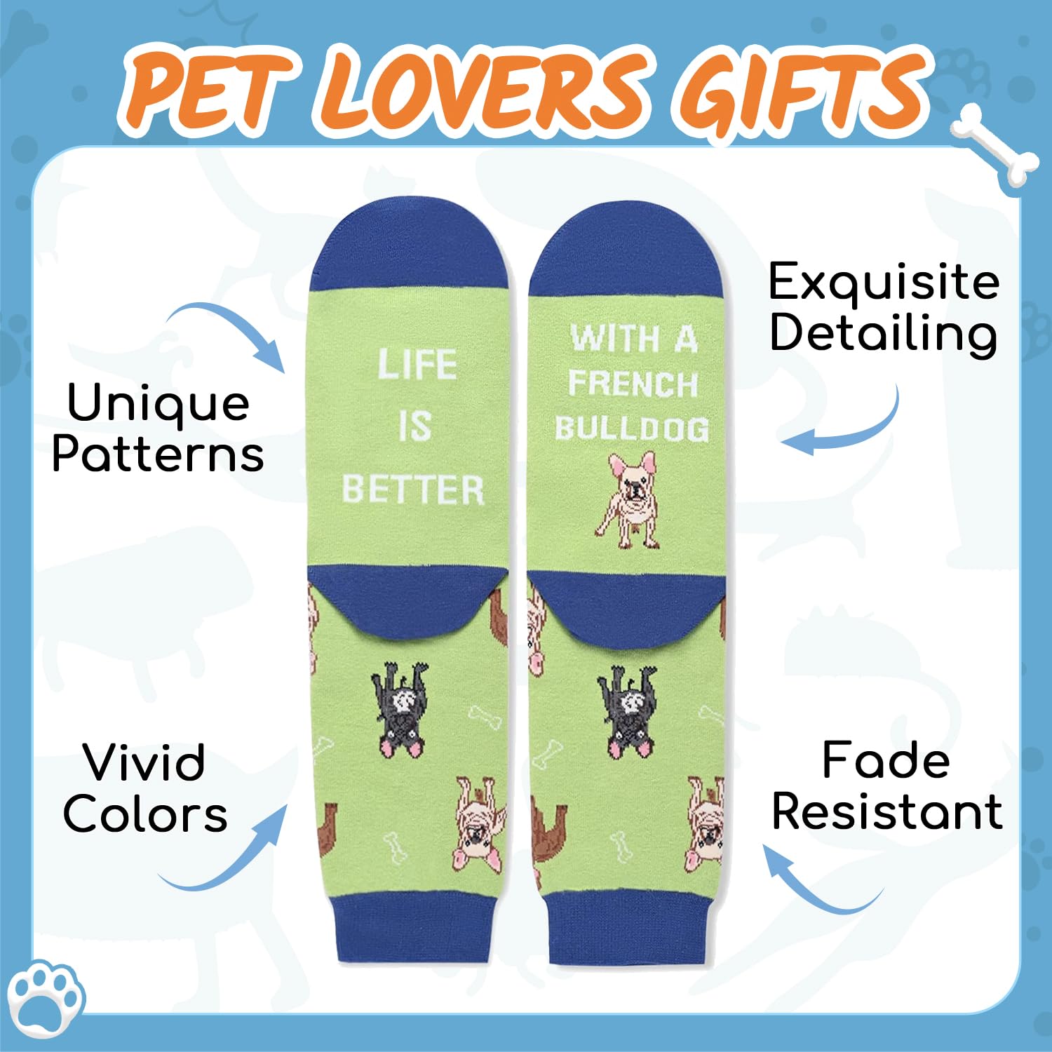 FRENCH BULLDOG SOCKS - Our funny socks are perfect for both men and women. They feature cute French Bulldogs and bones in green, along with the funny saying "LIFE IS BETTER WITH A FRENCH BULLDOG." ..