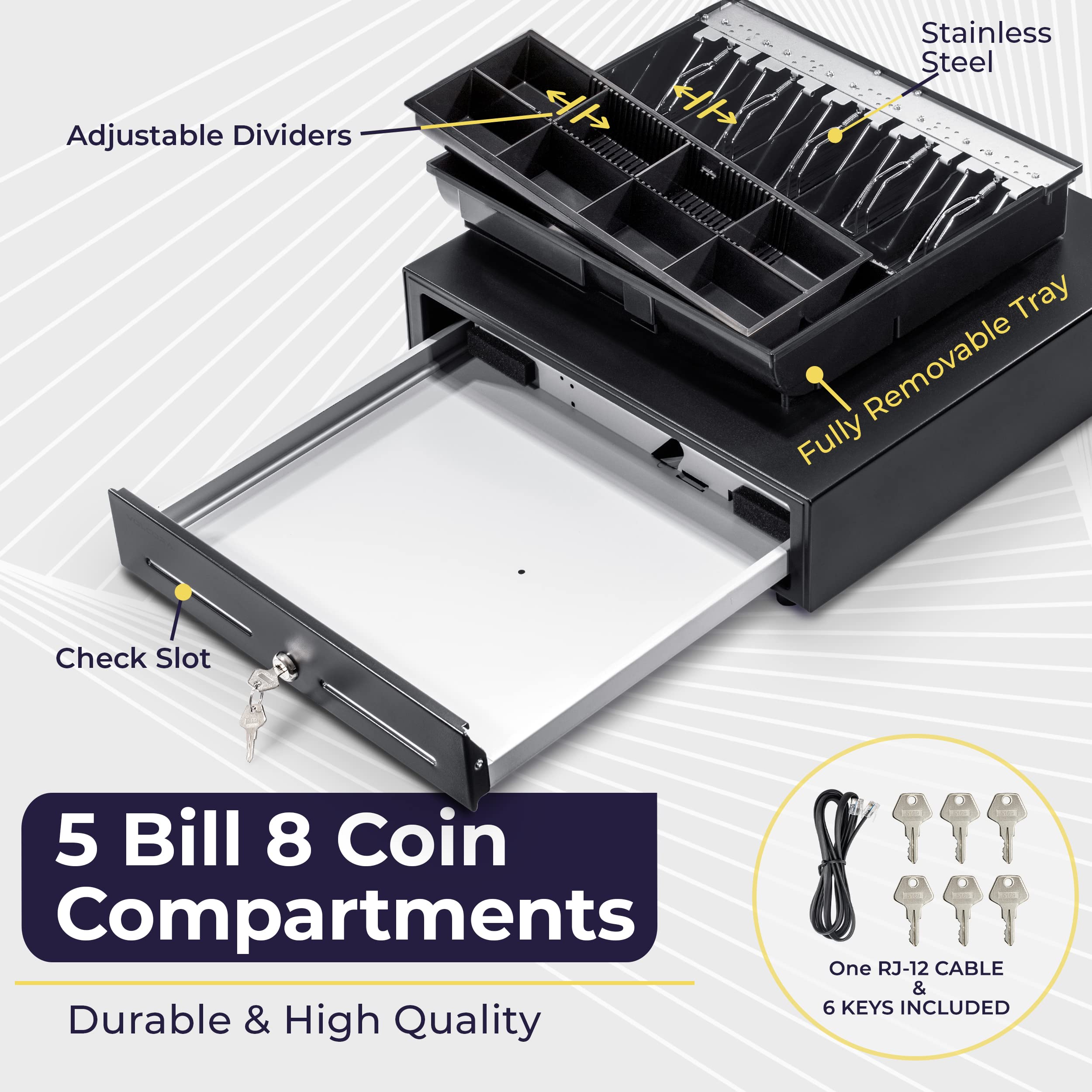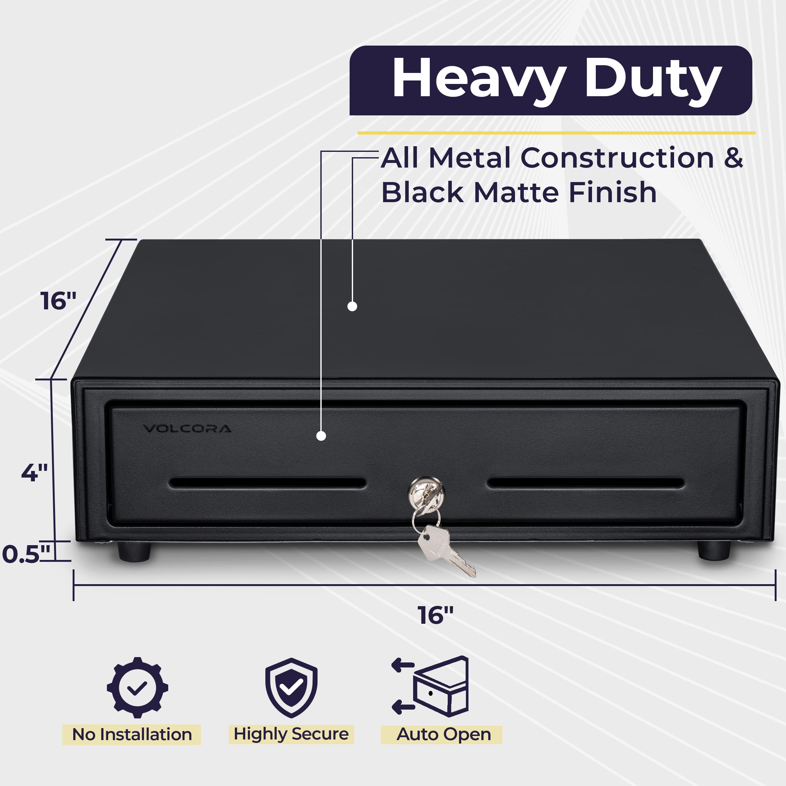 Secured with 3-position key lock: 1-manual open, 2-auto open by printer/POS, 3-lock. Package includes 4 keys for additional backup.