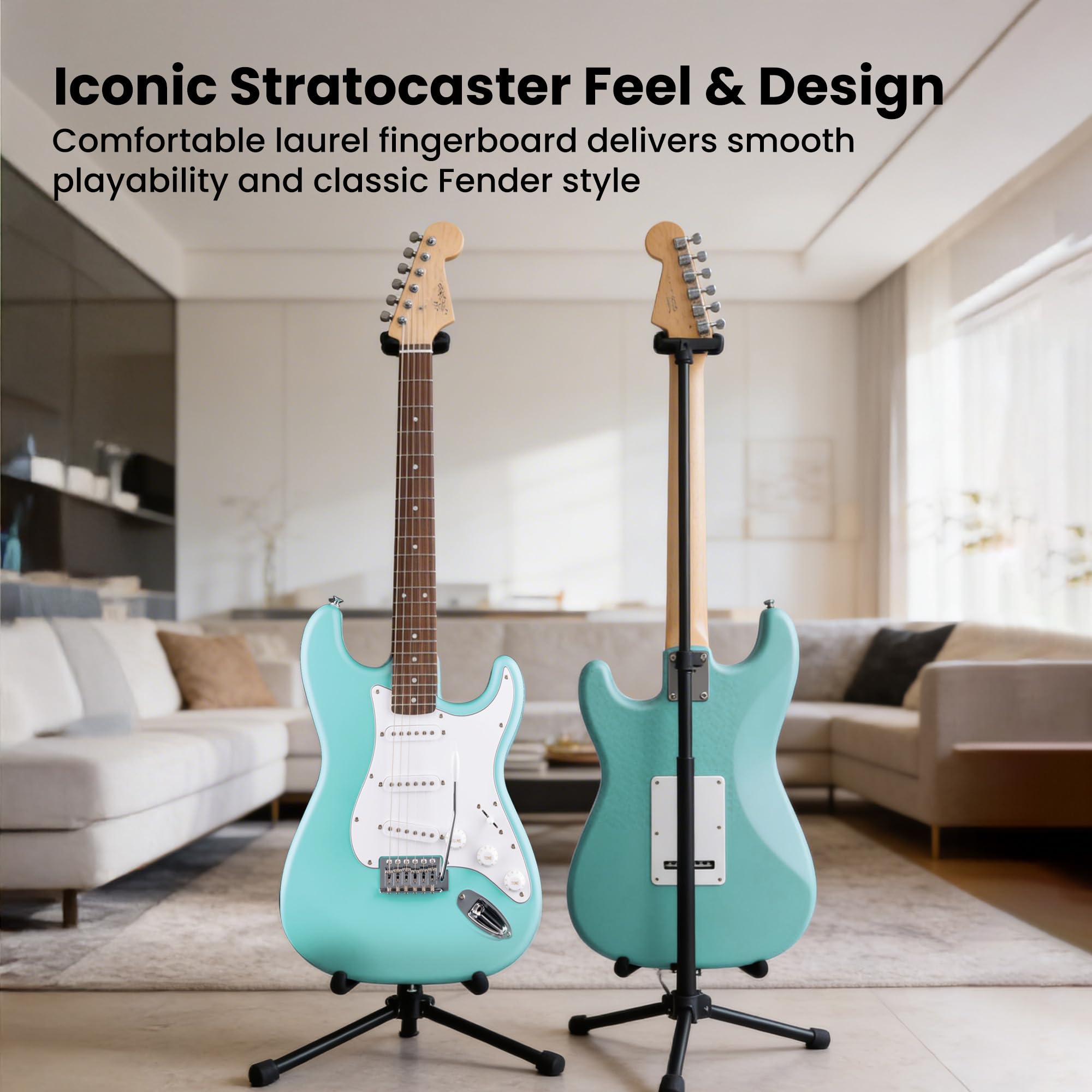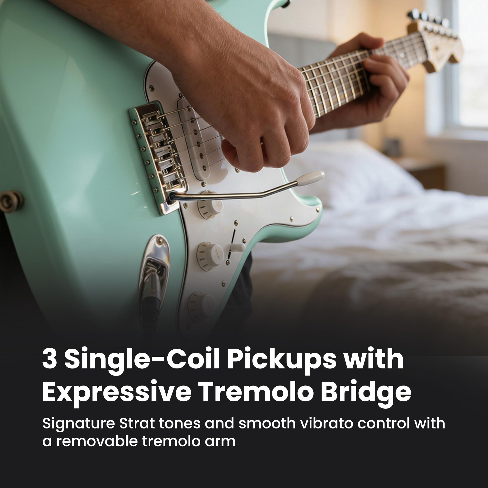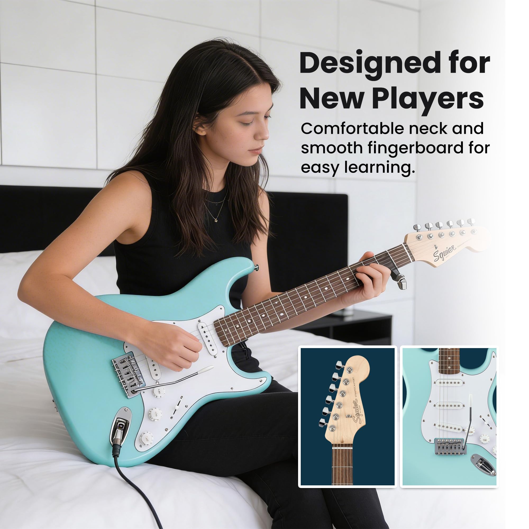 DESIGNED FOR BEGINNER COMFORT: Slim C-shaped neck and lightweight body provide comfortable playability with reduced hand strain; 21 frets support smooth movement while learning; three Squier single-coil pickups deliver bright, versatile Stratocaster tone suitable for rock, pop, and practice sessions