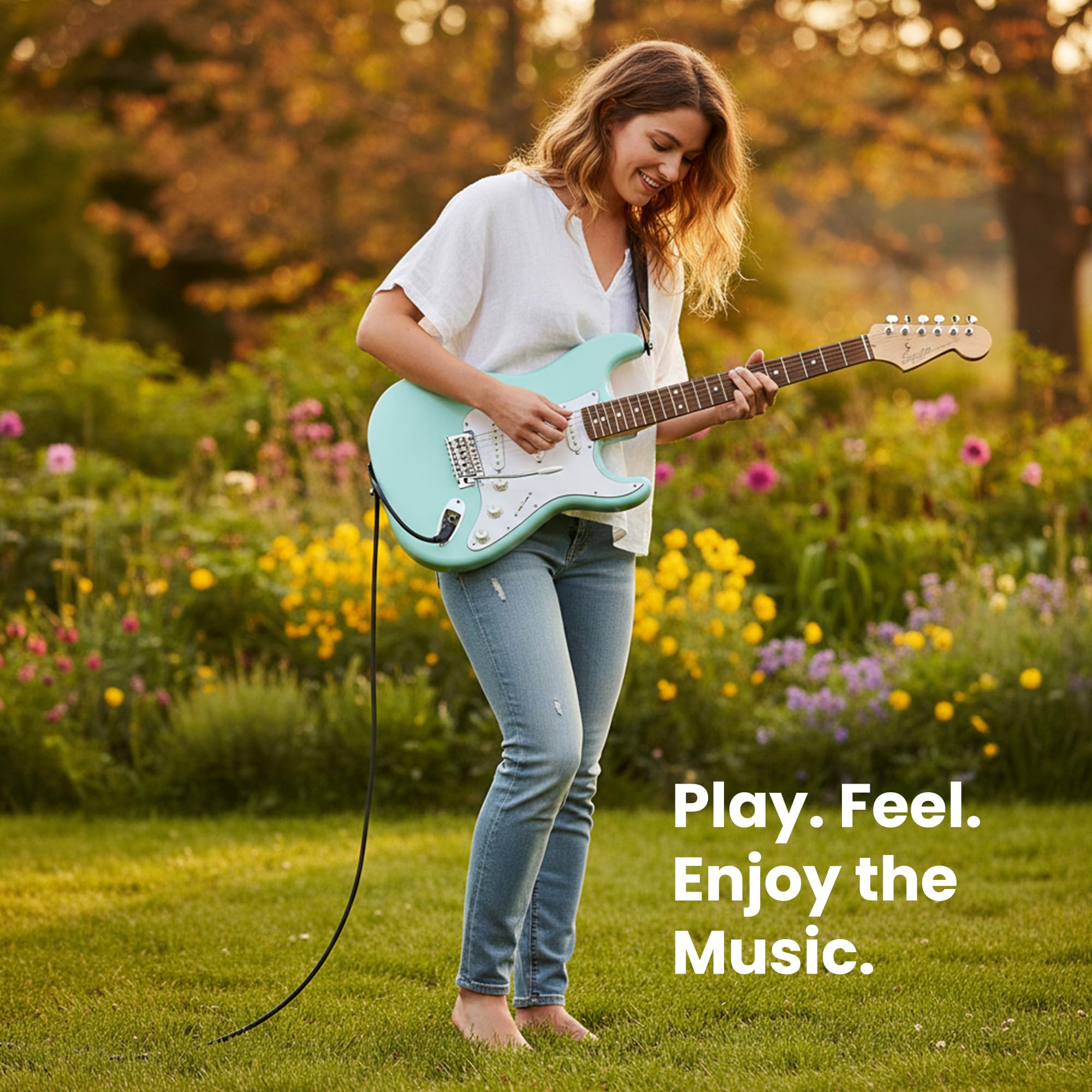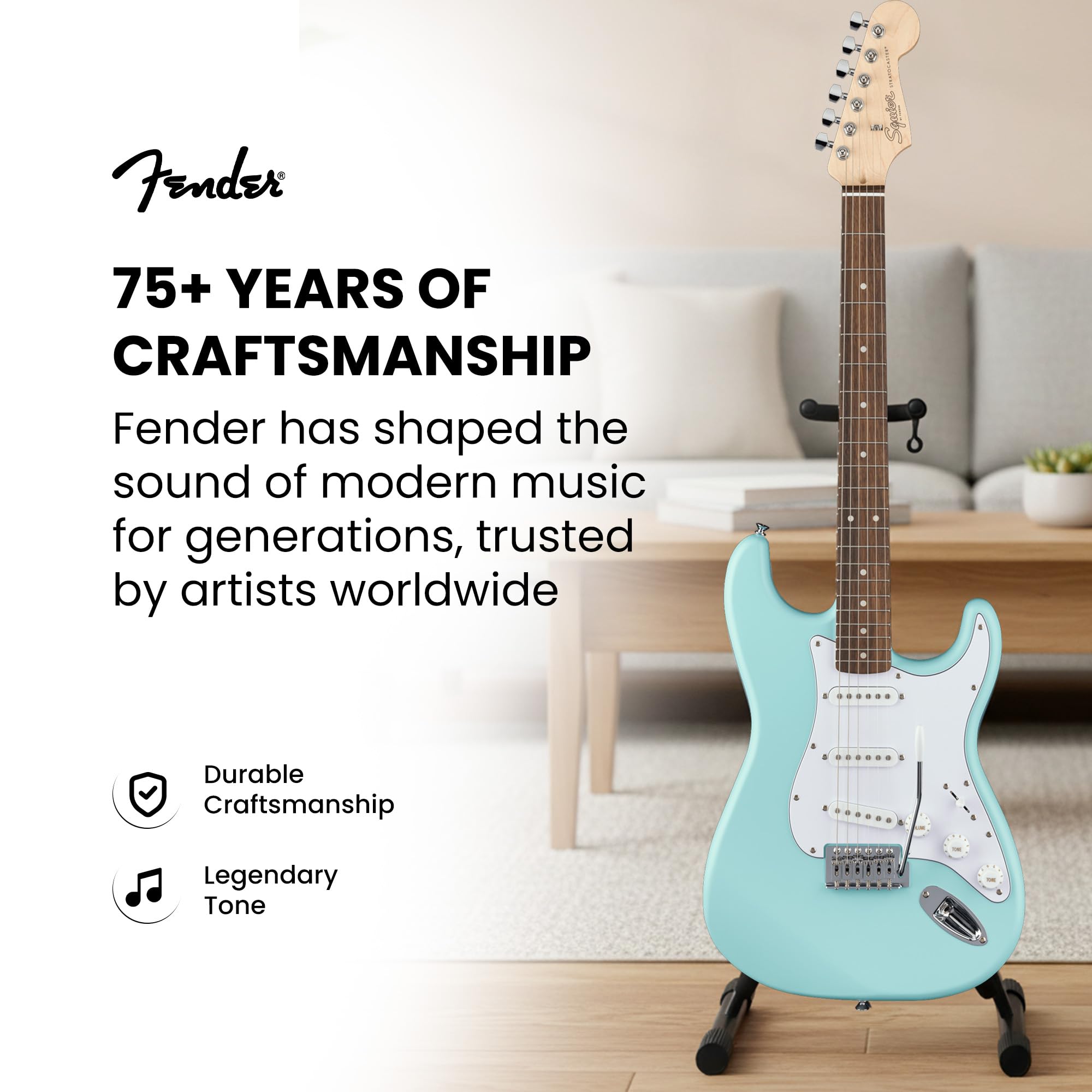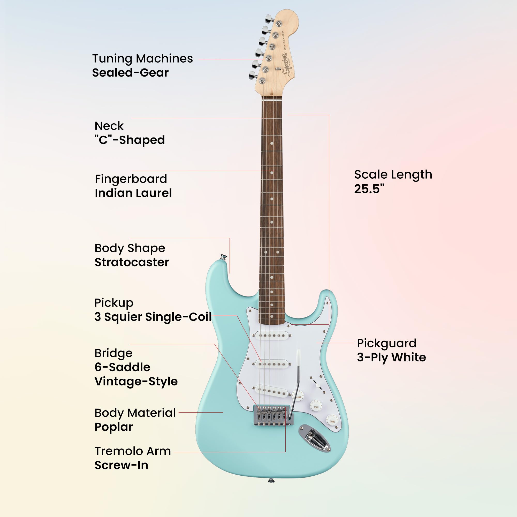 DESIGNED FOR BEGINNER COMFORT: Slim C-shaped neck and lightweight body provide comfortable playability with reduced hand strain; 21 frets support smooth movement while learning; three Squier single-coil pickups deliver bright, versatile Stratocaster tone suitable for rock, pop, and practice sessions