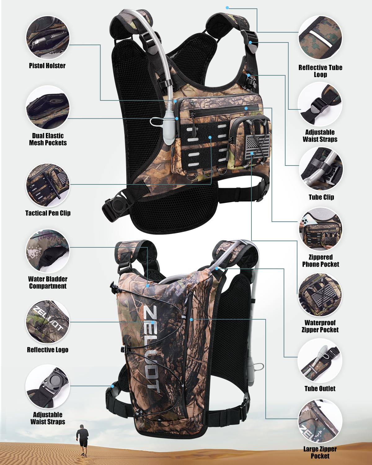 Plenty of Storage - This chest bag features 3 waterproof zippered front pockets to securely hold essentials like your phone, keys, and energy gels. A detachable, bounce-free pistol holster ensures secure storage for small to mid-sized pistols, while the tactical pen slot keeps emergency gadgets within easy reach. Two large back pockets fit a water bladder, towel, extra clothing.