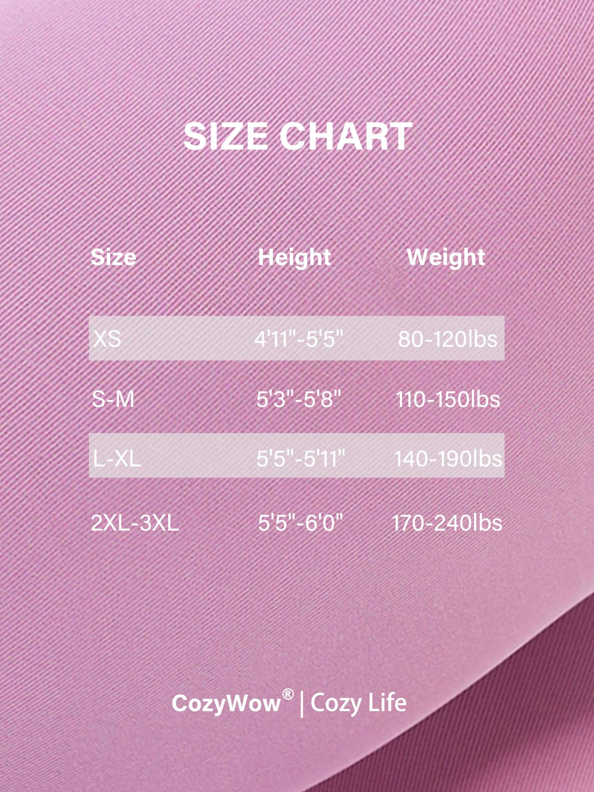 Size Recommended:XS: Height 4'11"-5'5" , Weight 80-120lbs. S-M: Height 5'3"-5'8", Weight 110-150lbs. L-XL: Height 5'5"-5'11", Weight 140-190lbs. 2XL-3XL: Height 5'5"-6', Weight 170-240lbs. Our stockings' design ensure elegance and comfort for every body type.