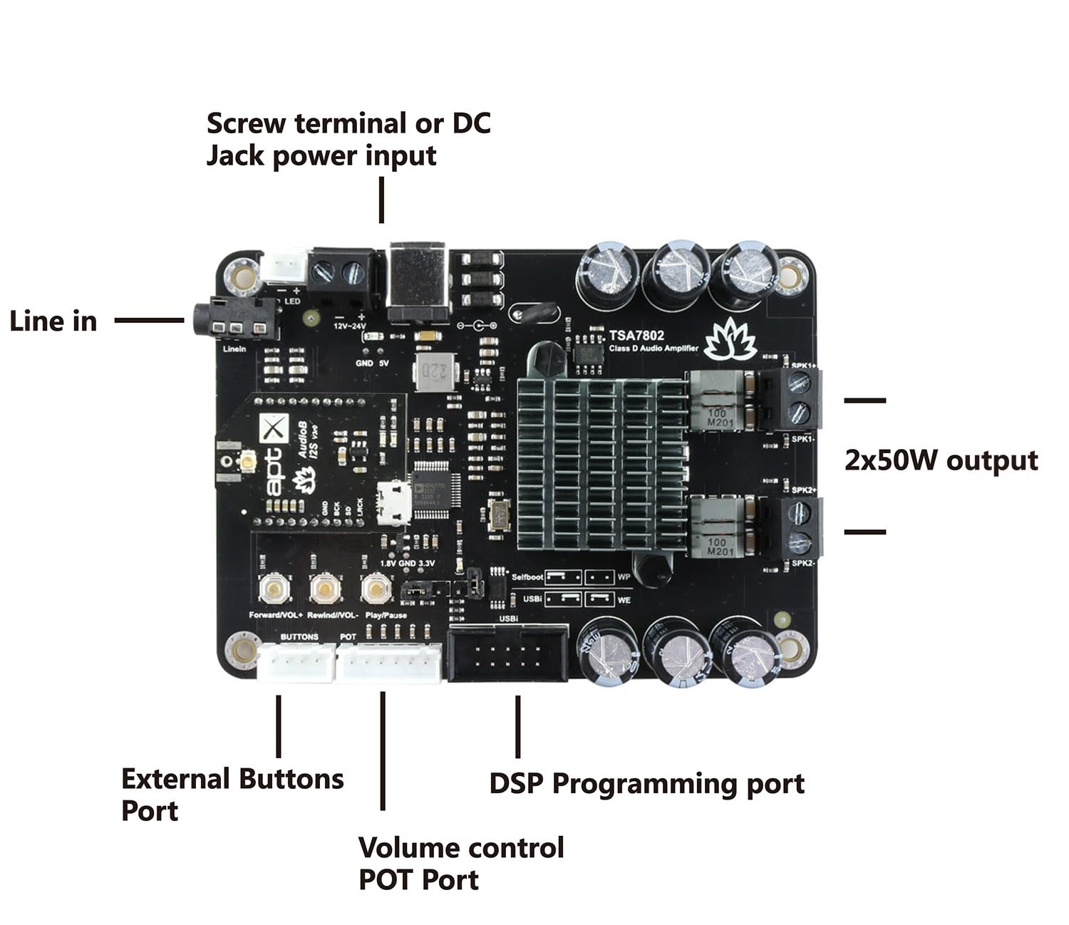 TSA7802B 2x50W 2 channels Bluetooth+DSP amplifier board with an AudioB I2S Bluetooth module that supports Apt-X. TSA7802B is a very flexible DSP/DAC/Amplifier combination board. It has perfect class-D architecture(Based on TPA3116D2) and 2 channels have 50W power output. All the channels are capable of outputting nominal power simultaneously and continuously. This board can be powered by any DC12V-24V power supply. It can be used to drive any 4Ω or 8Ω passive speakers(Subwoofer channel can drive 2Ω speaker). It's a 2 channels amplifier board.(User can change the DSP program to let it becomes right or left channel). You can pair it with a mobile phone or a computer (etc). Power the amplifier board. Use your phone or PC (etc) to search for a new Bluetooth device. The module will appear as "TSA7802B". You don't need a PIN, pair it and then you can play music. The highlight point is ADAU1701 DSP chip on board. User can set each channel audio tones separately. Apt-X and TWS supported. Therefore, Users can stream audio to 2 paired amplifier boards at the same time wirelessly.