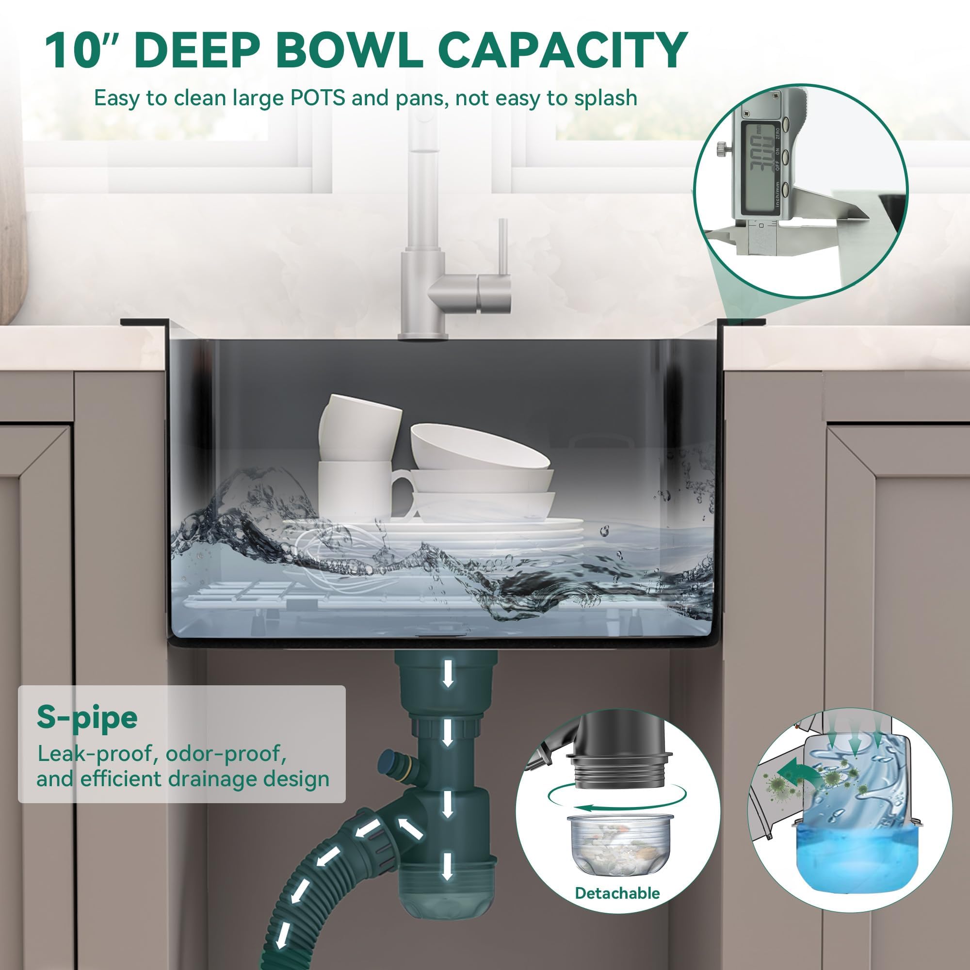 Efficient Draining: Our small deep kitchen sink offers sloping bottom for smooth water flow; S-shaped drainpipe, and the removable base allows for easy cleaning of residual debrisStandard 3.5" (90mm) drain opening suitable for any garbage disposal