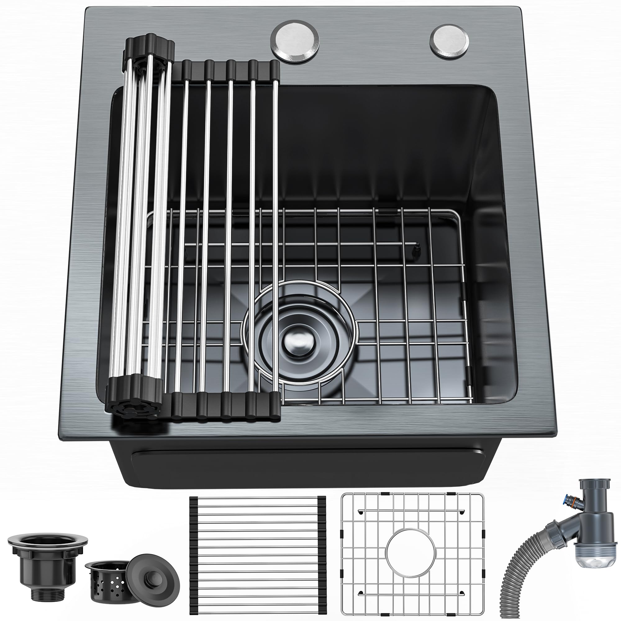 Multifunctional Sink Combo: kitchen sink measures 15" x 15" x 10" (bowl size 12.9" x 10.9" x 9.6") for ample space and a modern look; Comes with a foldable roller shutter, sink grid, and drainpipe for a one-stop washing and draining solution