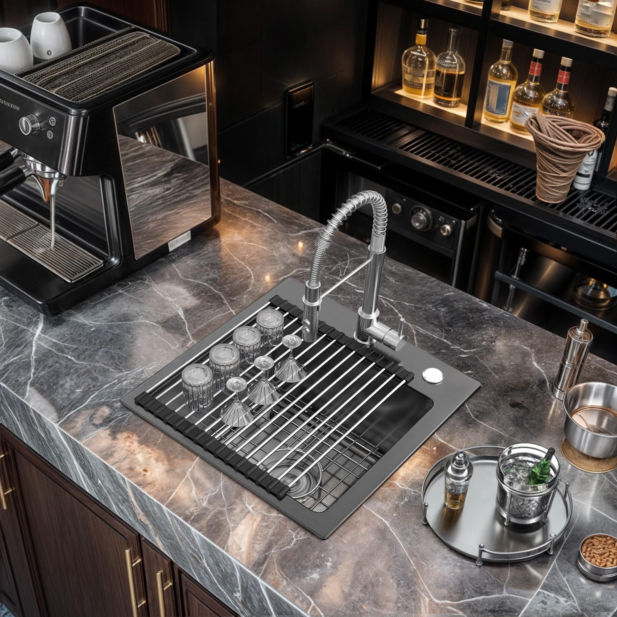 Easy and Quiet Installation: This black single bowl bar sink features a large sound-absorbing pad for a tranquil experience; The sink can be installed using a simple drop-in method, ensuring its stability during use; Fit for homes, businesses, bars, and RVs