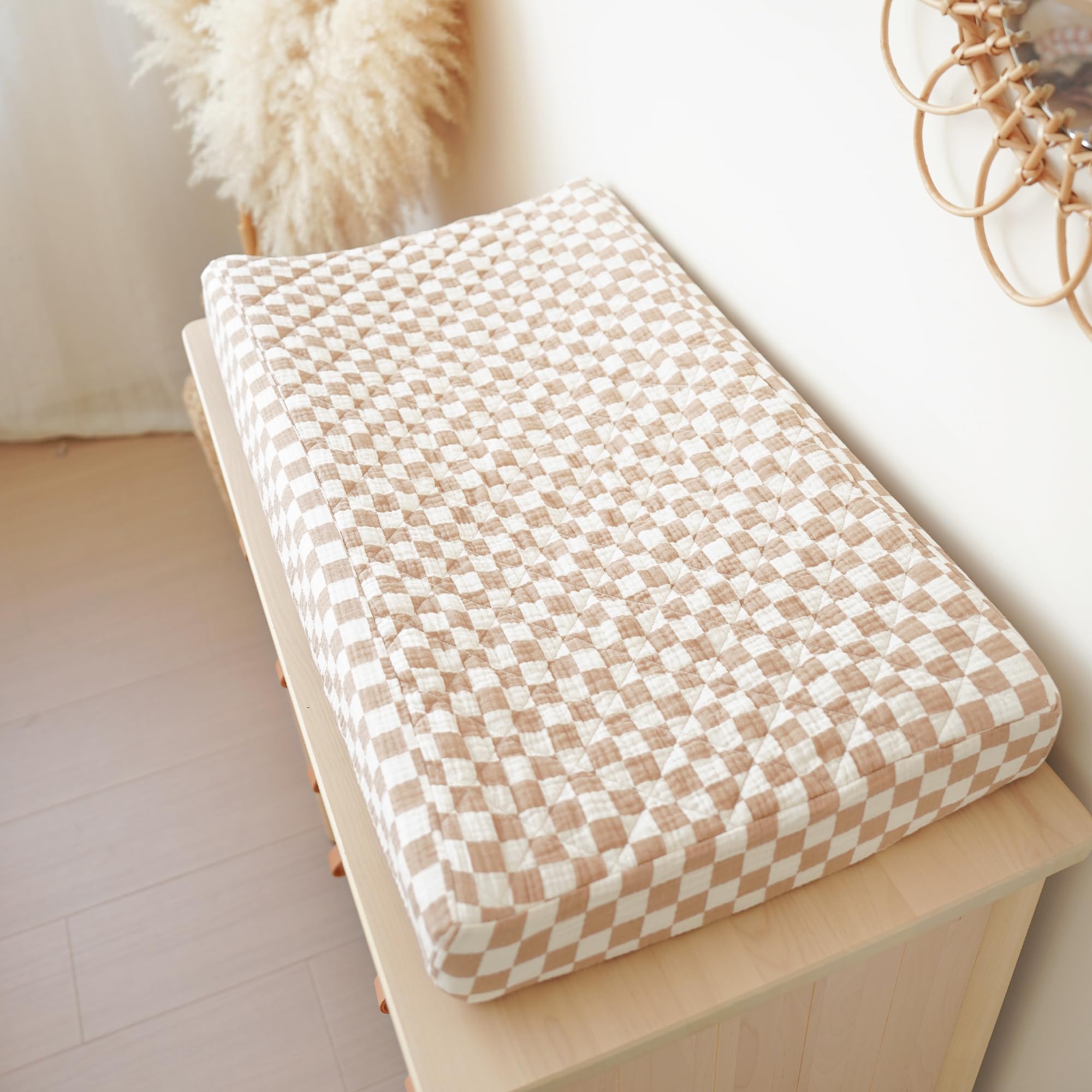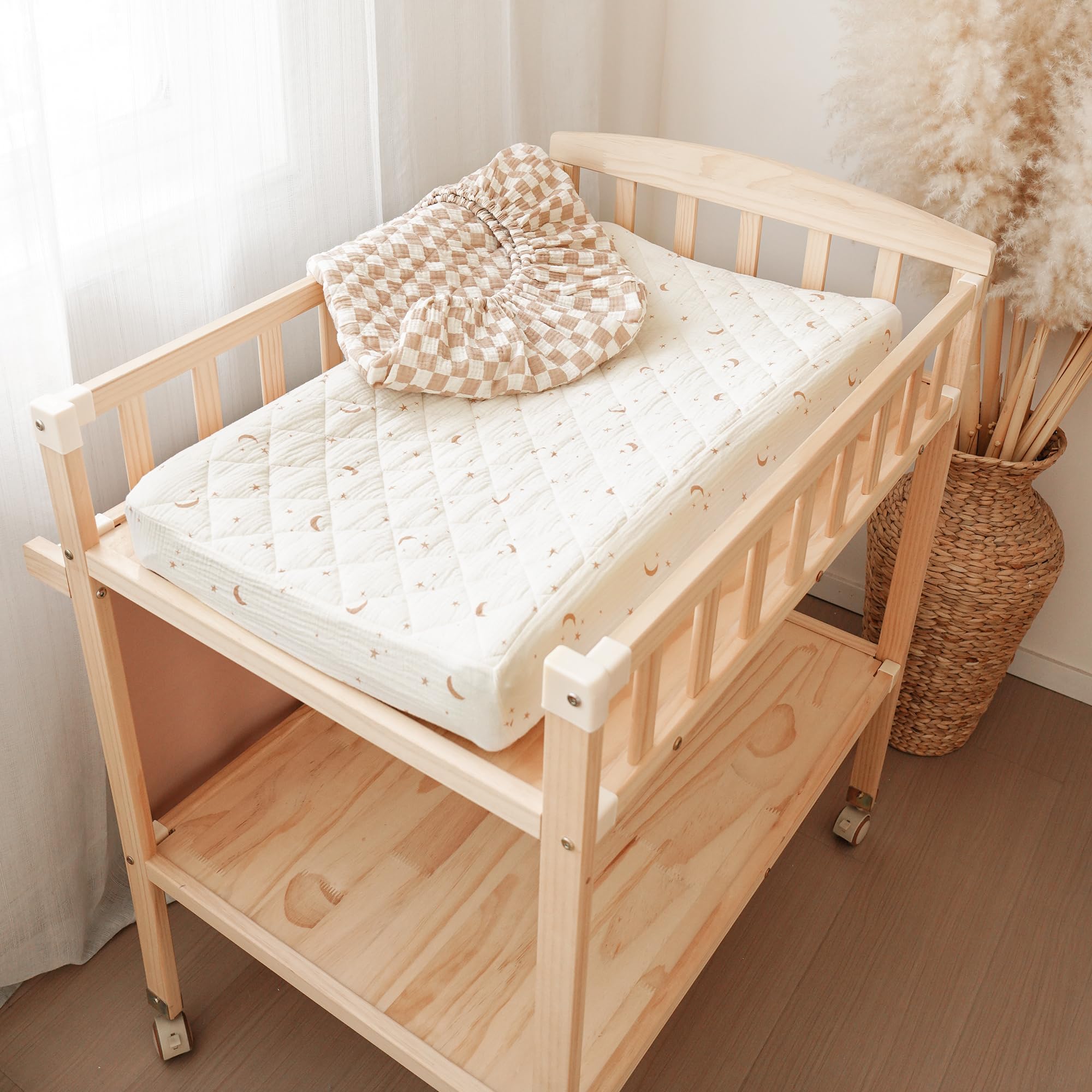 Quilted and Soft Fabric: Our changing pad cover consists of three layers: the top layer is made of 100% cotton (muslin), which is soft and absorbent; the middle layer is quilted with soft padding to ensure coziness and comfort; and the bottom layer is made of 100% waterproof polyester to protect the pad from wetting. Our unique design provides a comfortable touch for your baby while ensuring waterproof functionality, making our changing pad soft and perfect for delicate baby skin.