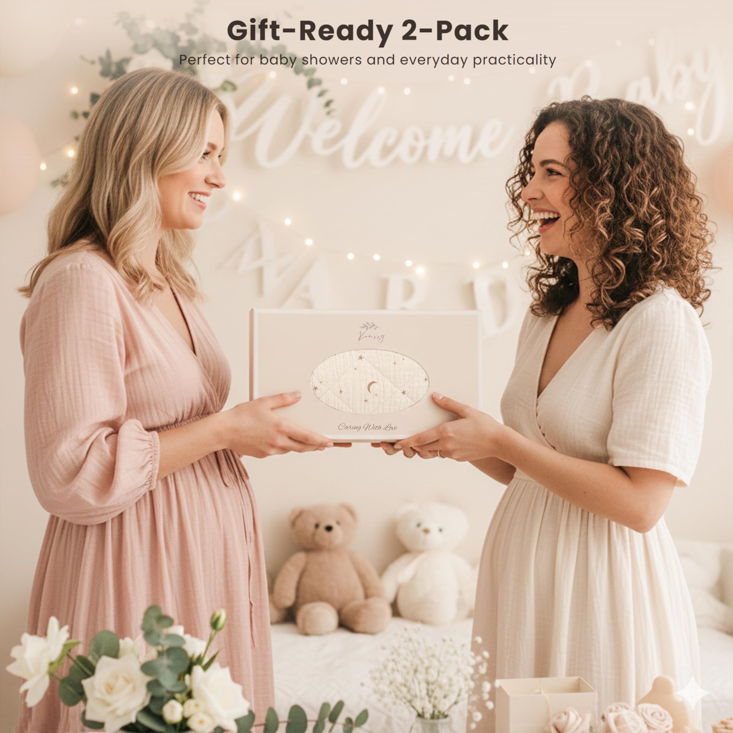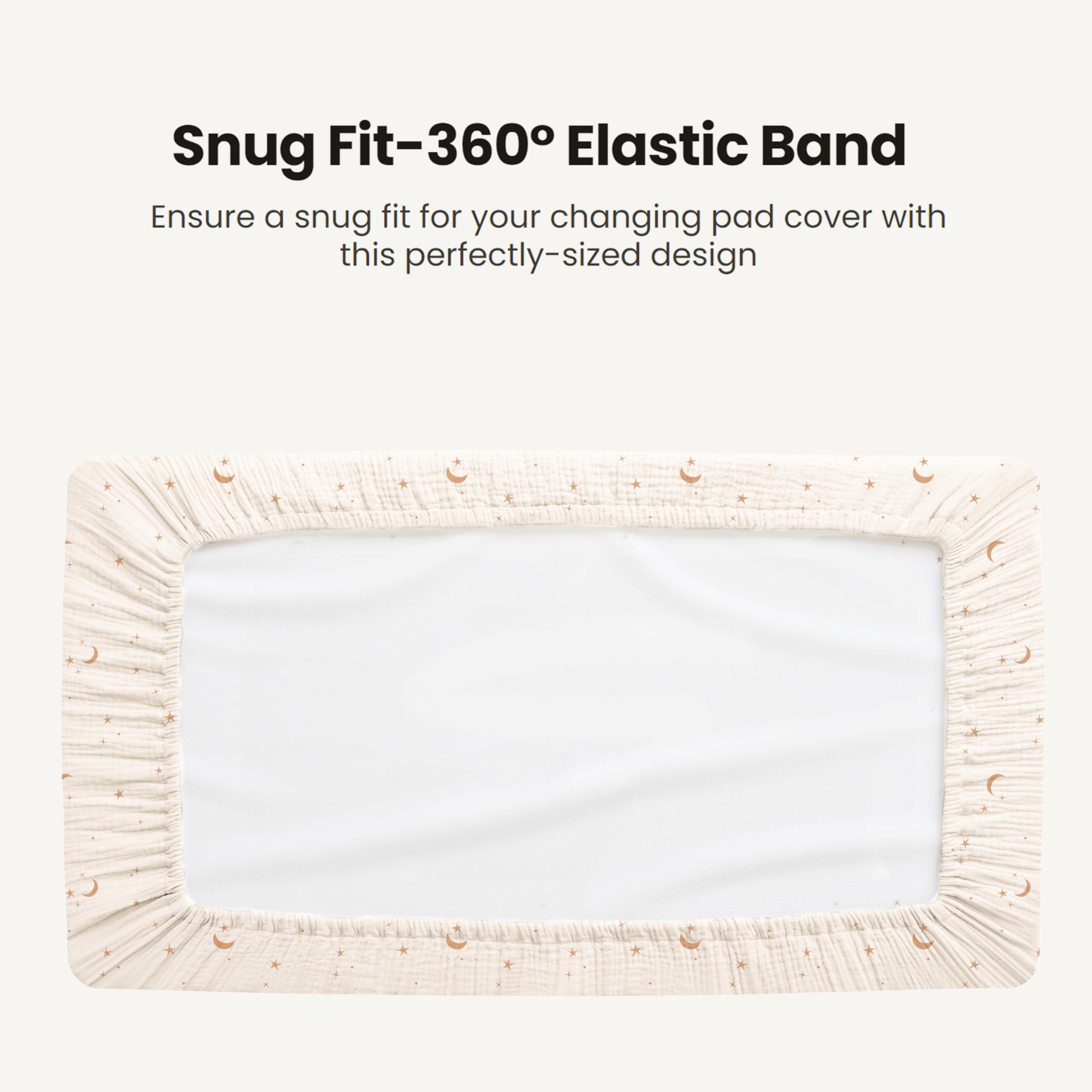 Snug Fit: Our muslin changing pad cover measures 32β x 16βand features a fully encased 360-degree elastic. This design ensures a snug and secure fit on your changing pad. Say goodbye to slipping covers during diaper changes!