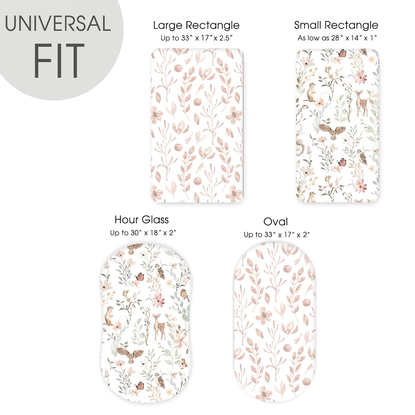 Universal Fit – Measuring 32" x 16" x 5". Our bassinet sheets fit almost all standard oval, round, rectangle, hourglass shaped bassinet mattress. Each bassinet mattress pad cover comes with an elastic band encased at the bottom for safety.