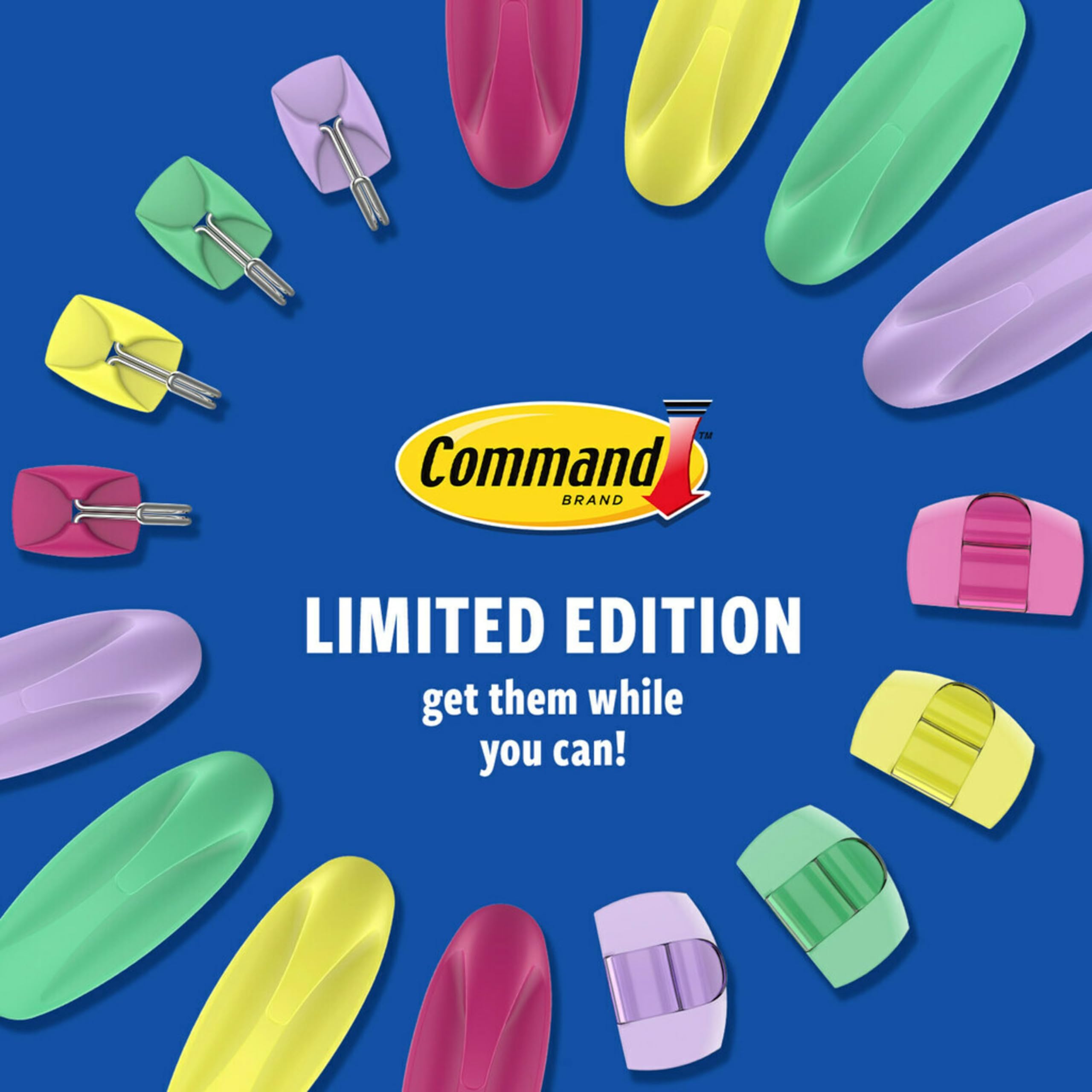Ready to make your space yours? Limited Edition Command Designer Hooks are here to help you decorate freely, all while staying damage-free. These bright Command Hooks are all about expressing yourself. They let you hang what you want, where you want, without the hassle of tools, making them the best way to decorate a dorm or apartment. Command adhesive holds as long as you need it to on a variety of smooth, finished surfaces. Whenever it's time to mix it up, these vibrant adhesive hooks remove cleanly with no sticky residue or damage left behind. Get inspired to organize, decorate, personalize, and feel good about your space with Command Indoor Hooks.
