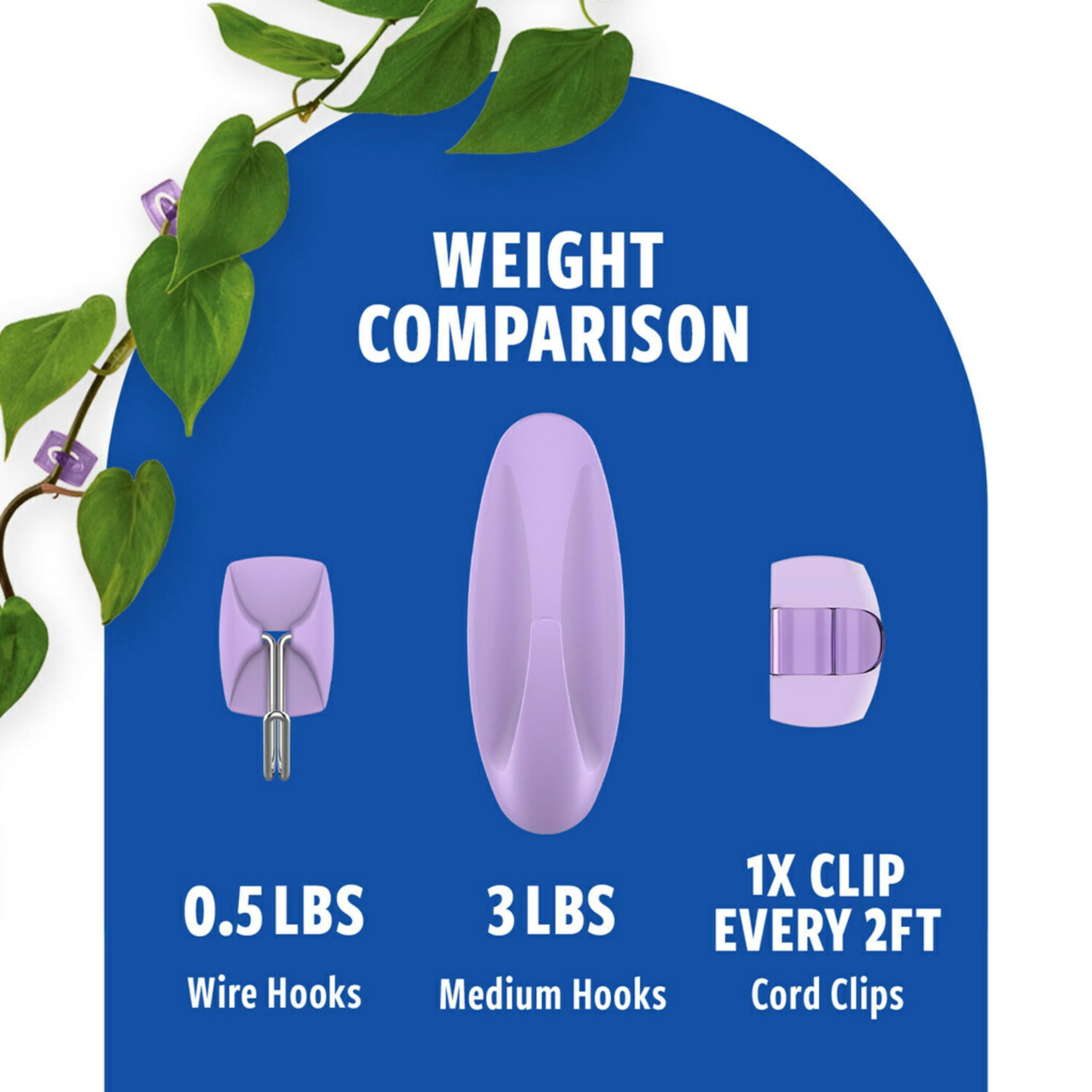 LIMITED EDITION PACK: Featuring our gentle Lavender color, this Limited Edition pack includes 2 medium designer hooks, 4 medium indoor strips, 3 small wire hooks, 4 small indoor strips, 4 clear round cord clips, and 5 small clear strips.