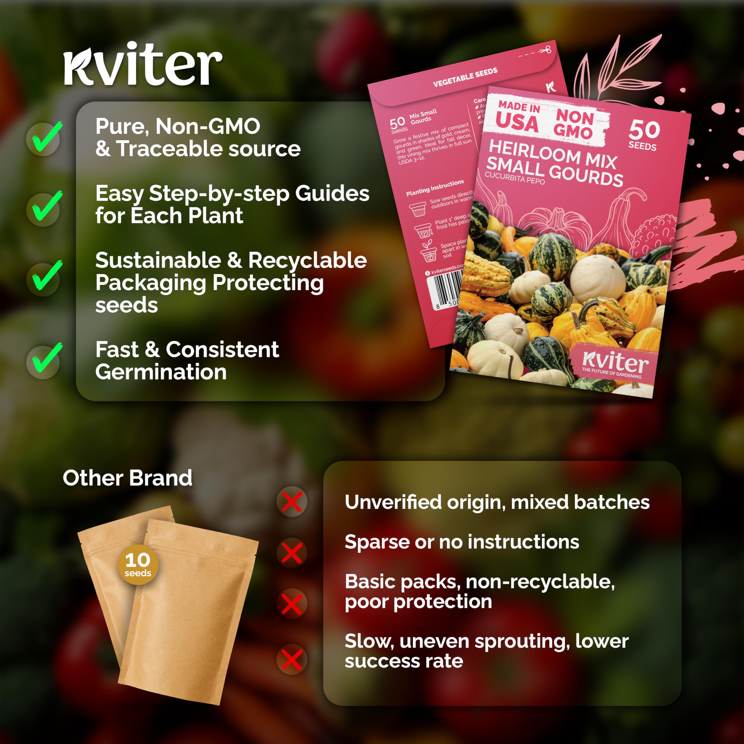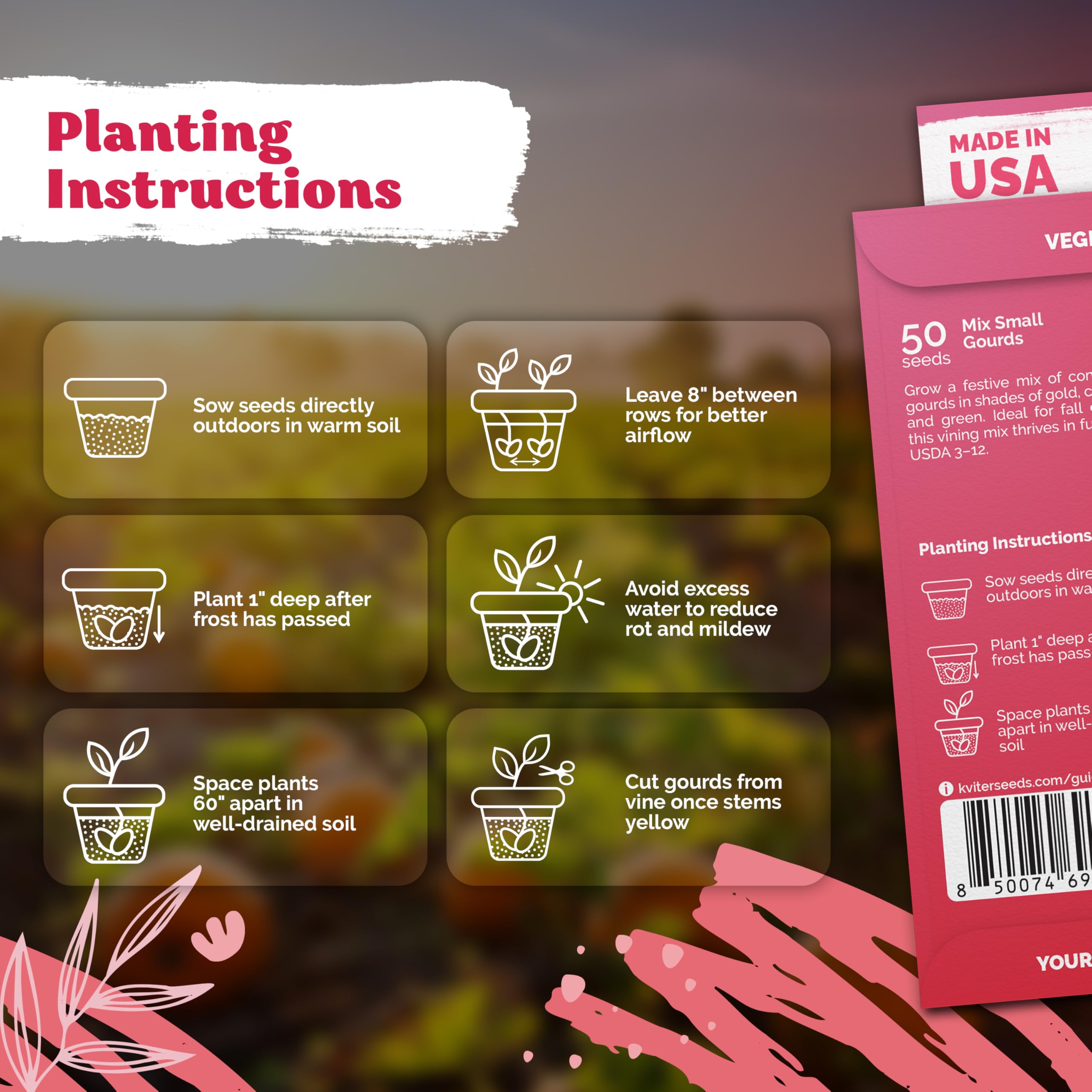 Eco‑Friendly Décor: Grow mixed gourds, enjoy as gourds for decorating, then compost the shells—zero‑waste gardening. Garden seeds packets add charm to veggie seeds collections and gourd crafts.