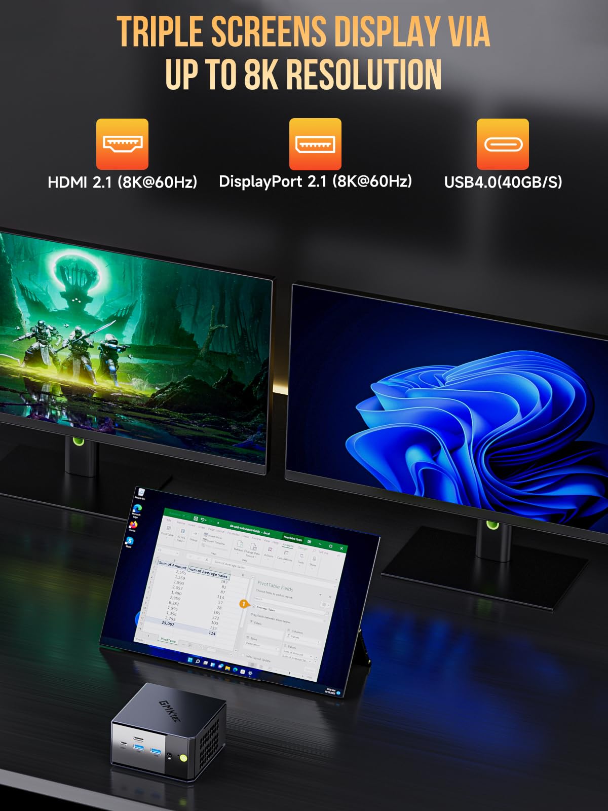 Triple Screen 8K Display Support - EVO-X1 AI Mini PC support 3-screen 8K simultaneous output via HDMI 2.1 (4K@60Hz), DisplayPort 2.1 (8K@60Hz), and USB 4 40Gbps Transfer speed (supporting PD3.0/DP1.4/DATA). Ideal for gaming, video editing, and multitasking, it provides expansive and crisp multi-display support