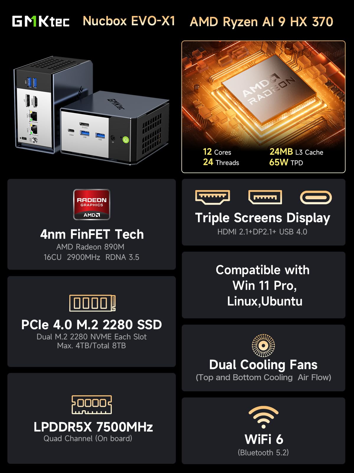 EVOLUTION AMD RYZEN 9 HX-370 MINI PC - GMKtec EVO-X1 is the next evolution in AI mini PC Ryzen AI 300 series, code named Strix Point. This processor brings out the highest TOPS from an NPU out, and it also marks the launch of AMD's latest Zen 5 microarchitecture. EVO-X1 delivers impressive speeds of up to 5.1GHz, ensuring smooth multitasking and fast performance. With a peak power consumption of 65W, it balances power and efficiency