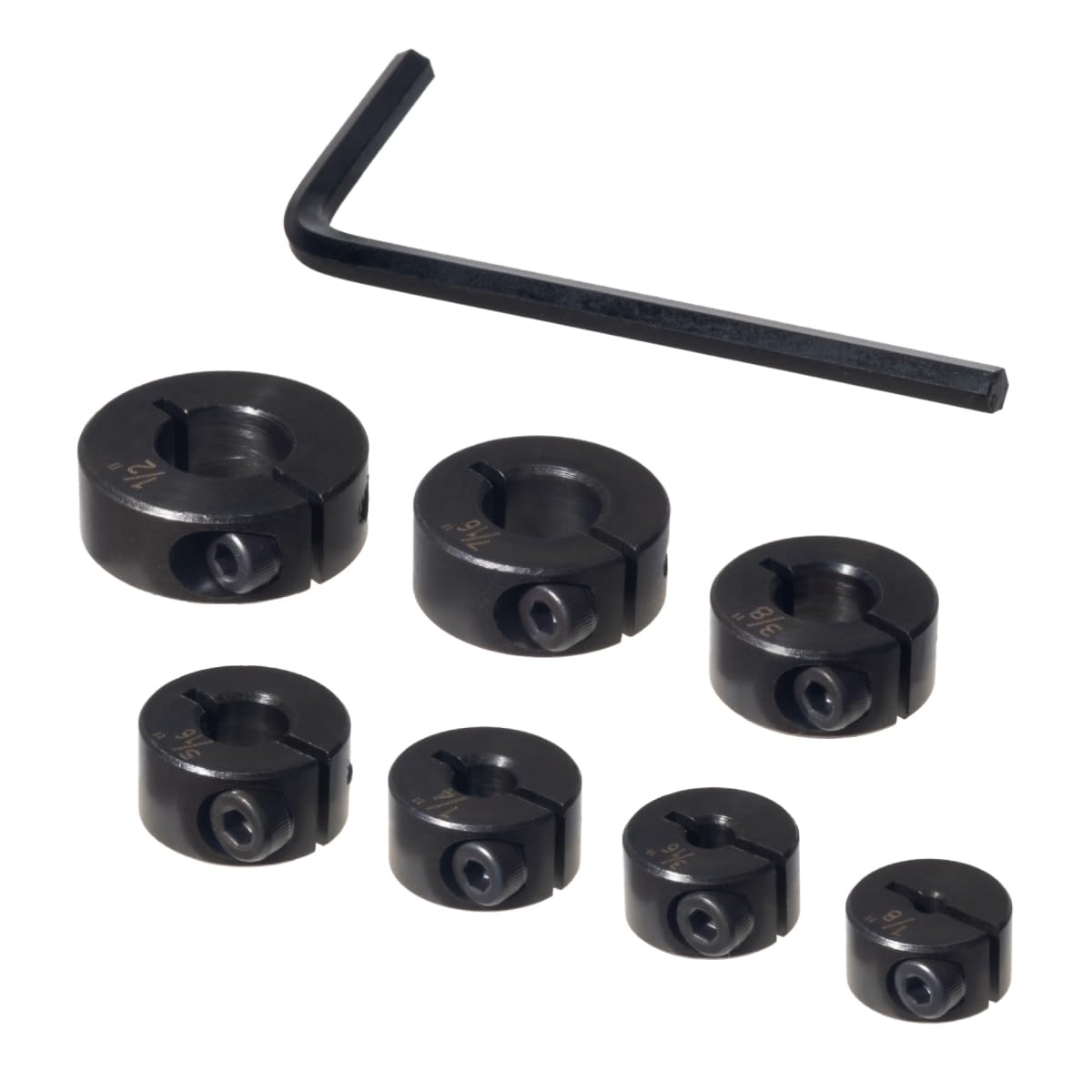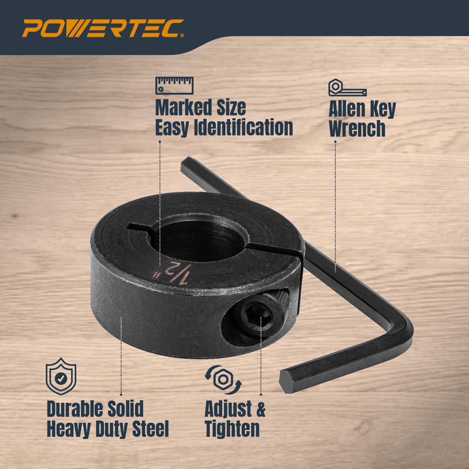 Introducing the 7-Piece Drill Bit Stop Collar Set by POWERTEC. This impressive collection of bit stop collars create the perfect drill holes with high precision and uniform depth for your portable drilling and woodworking applications. They feature a split ring design used to control the depth of the hole you are drilling – eliminating over & under drilling. This also helps to provide a secure, dependable grip around the diameter of your drill bit – delivering quick and easy utility. Premium Design Each collar is made with heavy duty steel for long-term durability. They will not mar your expensive drill bits as they never touch the bits. Unlike other brands, we have wisely marked each stop for easy bit identification and enhanced workflow. Contains 1/8 inch bit stop collar 3/16 inch bit stop collar 1/4 inch bit stop collar 5/16 inch bit stop collar 3/8 inch bit stop collar 7/16 inch bit stop collar 1/2 inch bit stop collar INCLUDED BONUS: An Allen Wrench is supplied to help adjust and install/uninstall the stop bits and can also be used for other projects. POWERTEC is a leading manufacturer of high quality woodworking tools and accessories, machines, and an assortment of OEM replacement parts. We are committed to exceeding expectations, while bringing the latest innovations, technology, and product development to the industry.