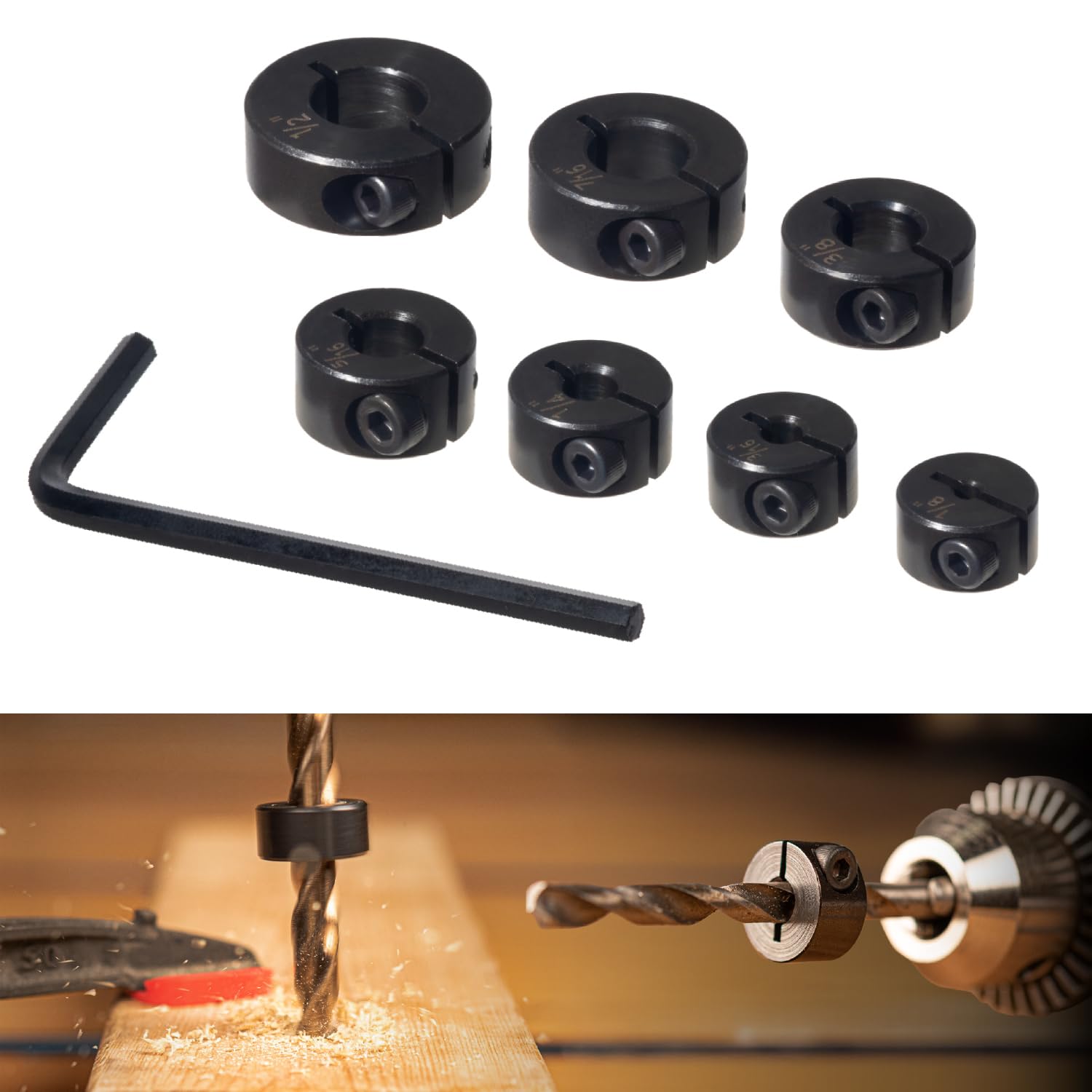 7 PIECE SET: Our drill bit stop collar set has various sizes 1/8", 3/16", 1/4", 5/16", 3/8", 7/16", and 1/2", ensuring compatibility with a wide range of drill bits. Equipped with Allen wrench for easy tightening, perfect for various drilling tasks.