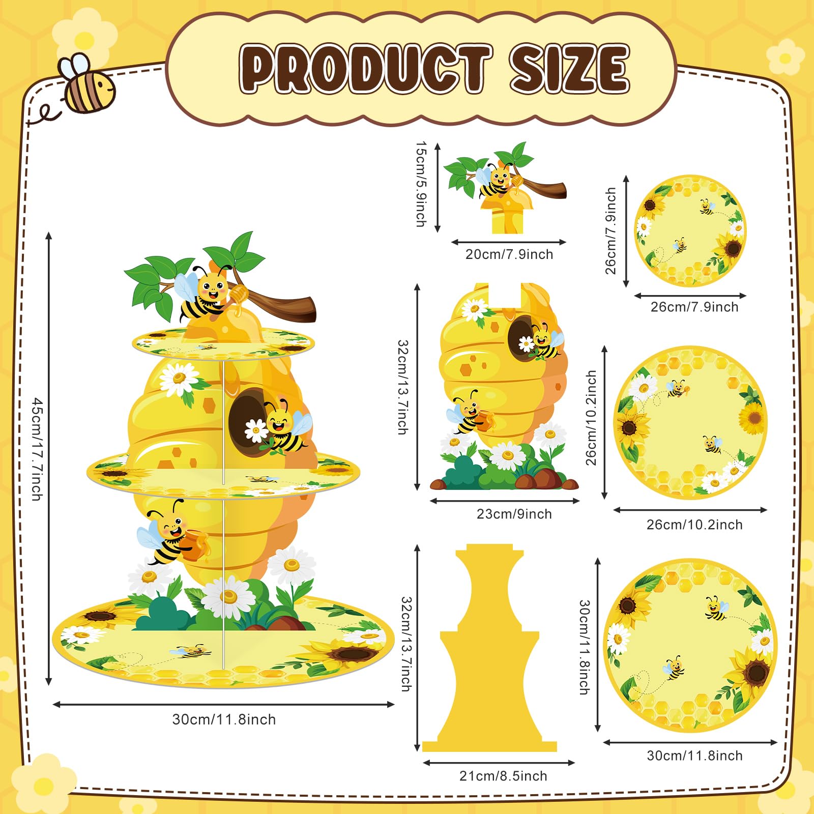 Package Includes: you will receive 1 piece 3 tier bee party cupcake holder party decorations, 20.5 inches in height, large tier measure 11.8 inches in diameter, and middle tier is 9.8 inches, small tier is 7.9 inches, which can hold enough cupcake and dessert, proper size add the finishing touch to your party decorations with this bee baby shower cupcake stand