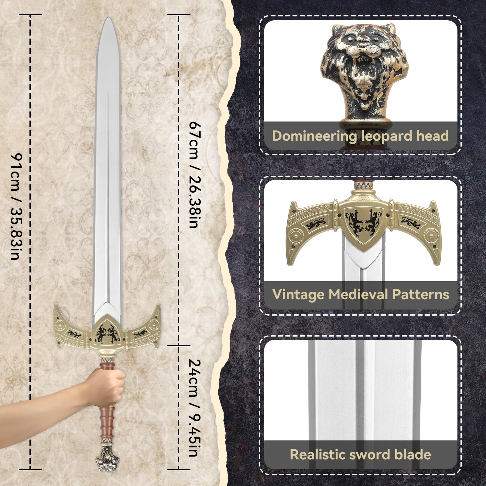 【Lightweight】Made of high-quality plastic material, which is light in weight and easy to carry around.The distinctive engraving and vintage paint job give this sword a sense of history.