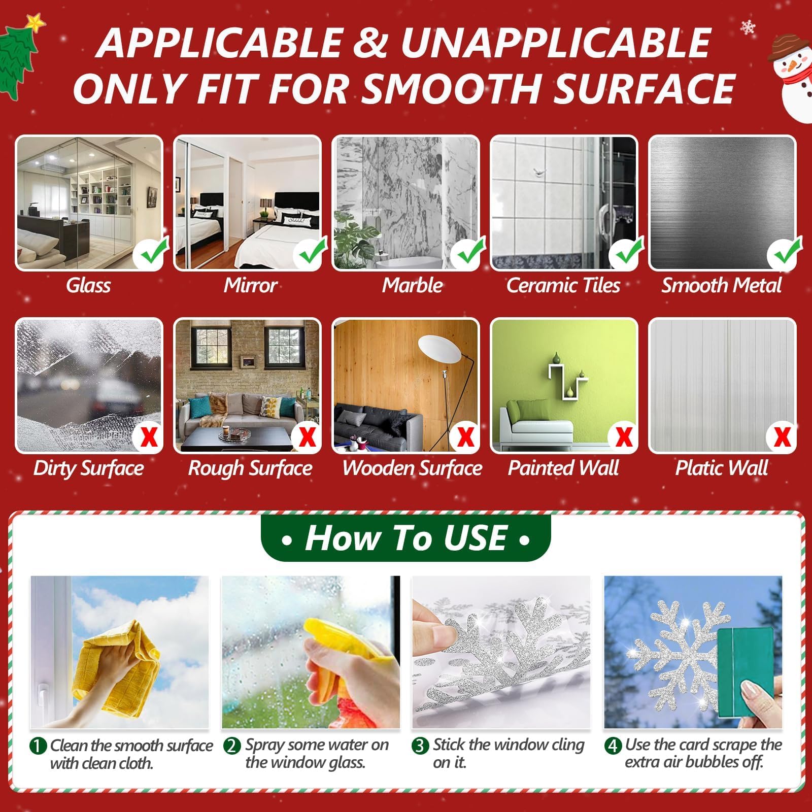 PERFECT FOR ANY SMOOTH SURFACE: Christmas glitter snowflakes window clings, fit for any smooth surface: sliding glass door, glass window, shop window, ceramic tiles, home appliance, etc. Great as Christmas stickers, Xmas decals, Static snowflakes stickers, snowflakes decals decorations, make amazing Christmas party supplies, Xmas decorations indoor ornaments, holiday home décor.