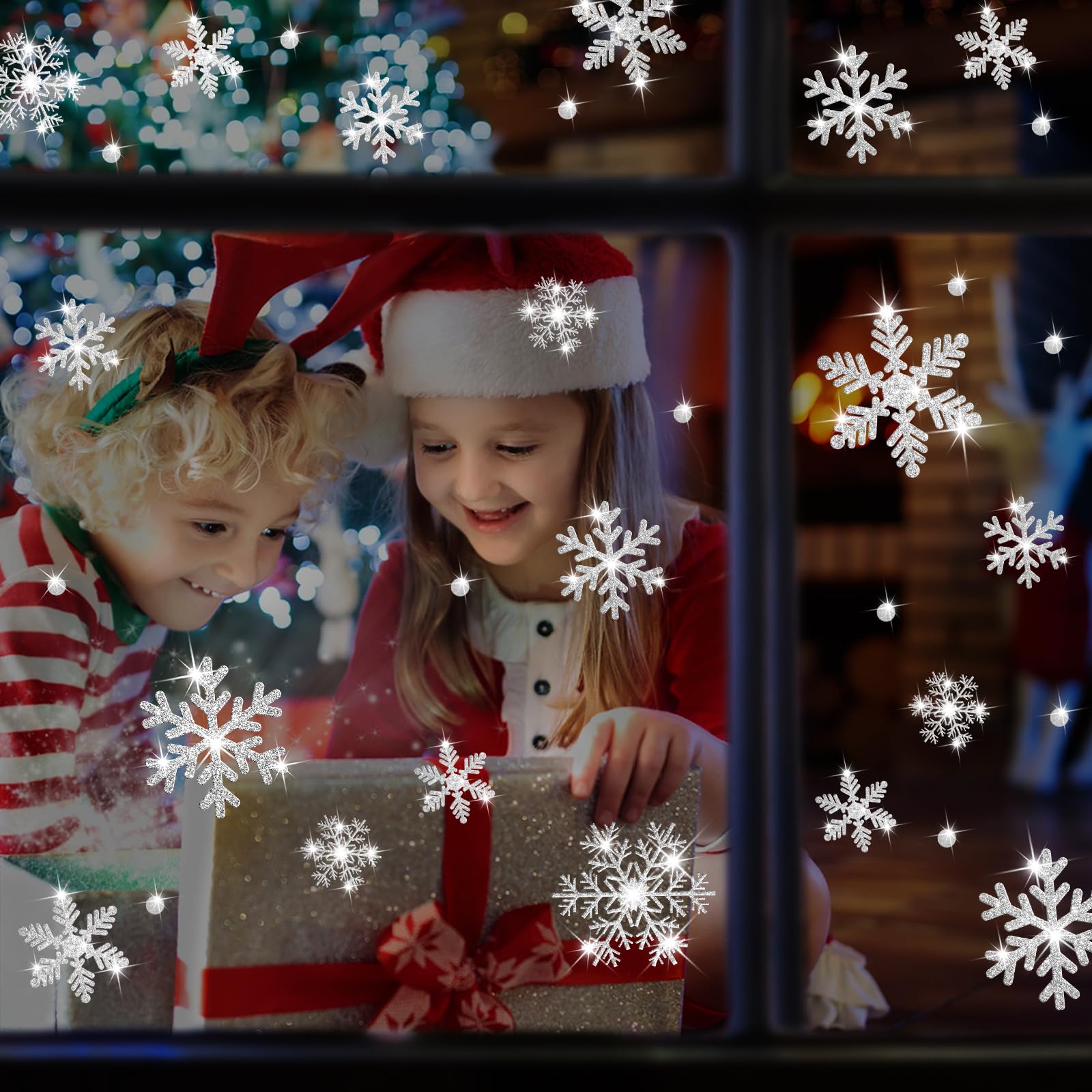 MESS-FREE XMAS WINDOW STICKERS: Static window decals, made of premium PVC materials, easy to stick on-and-off, NO GLUE, NO RESIDUE, NO DAMAGE & REUSABLE. The simplest & best snowflakes décor, make a huge hit for your Mess-Free Christmas party decorations ornaments! Awesome Christmas window sticker, bring endless fun and surprise for kids