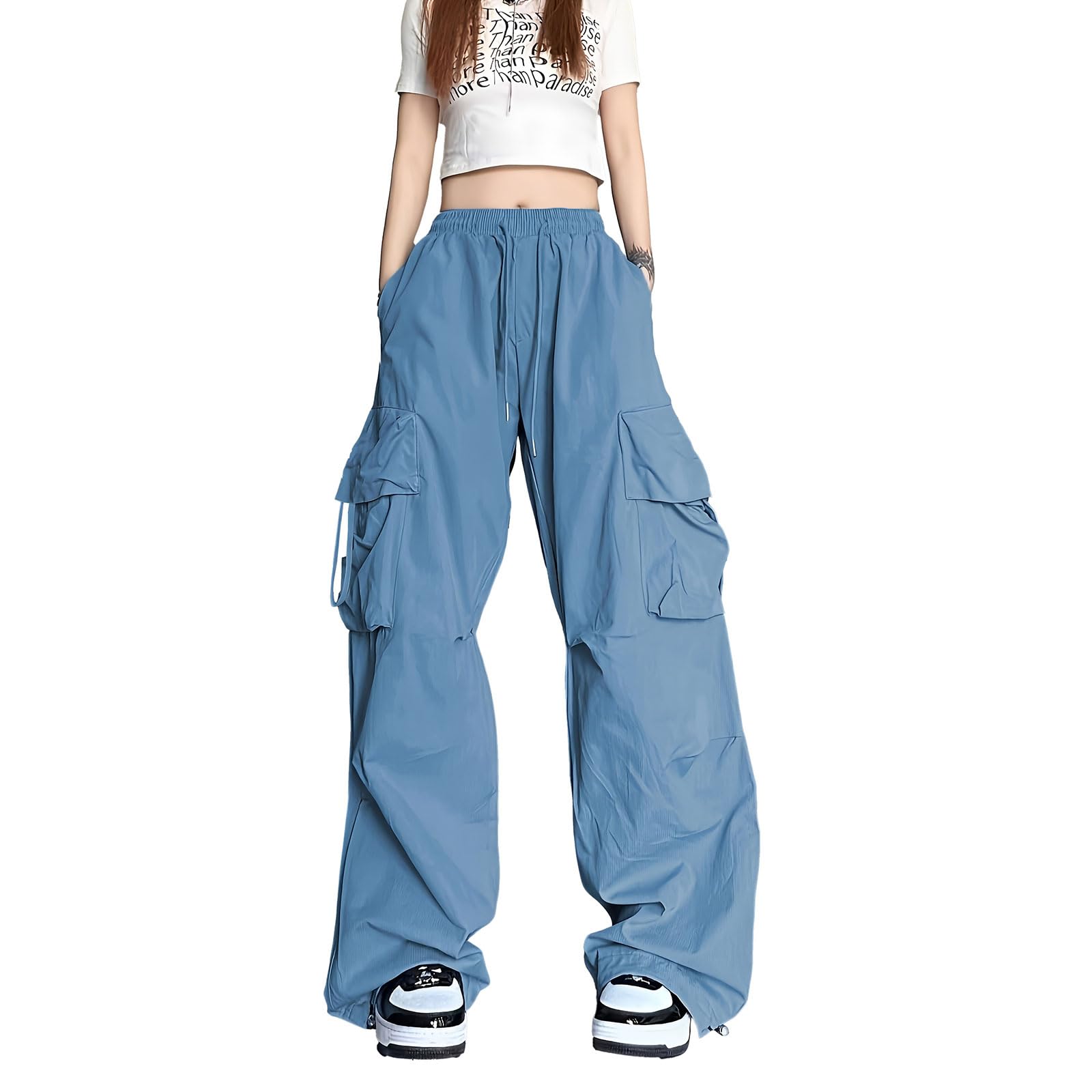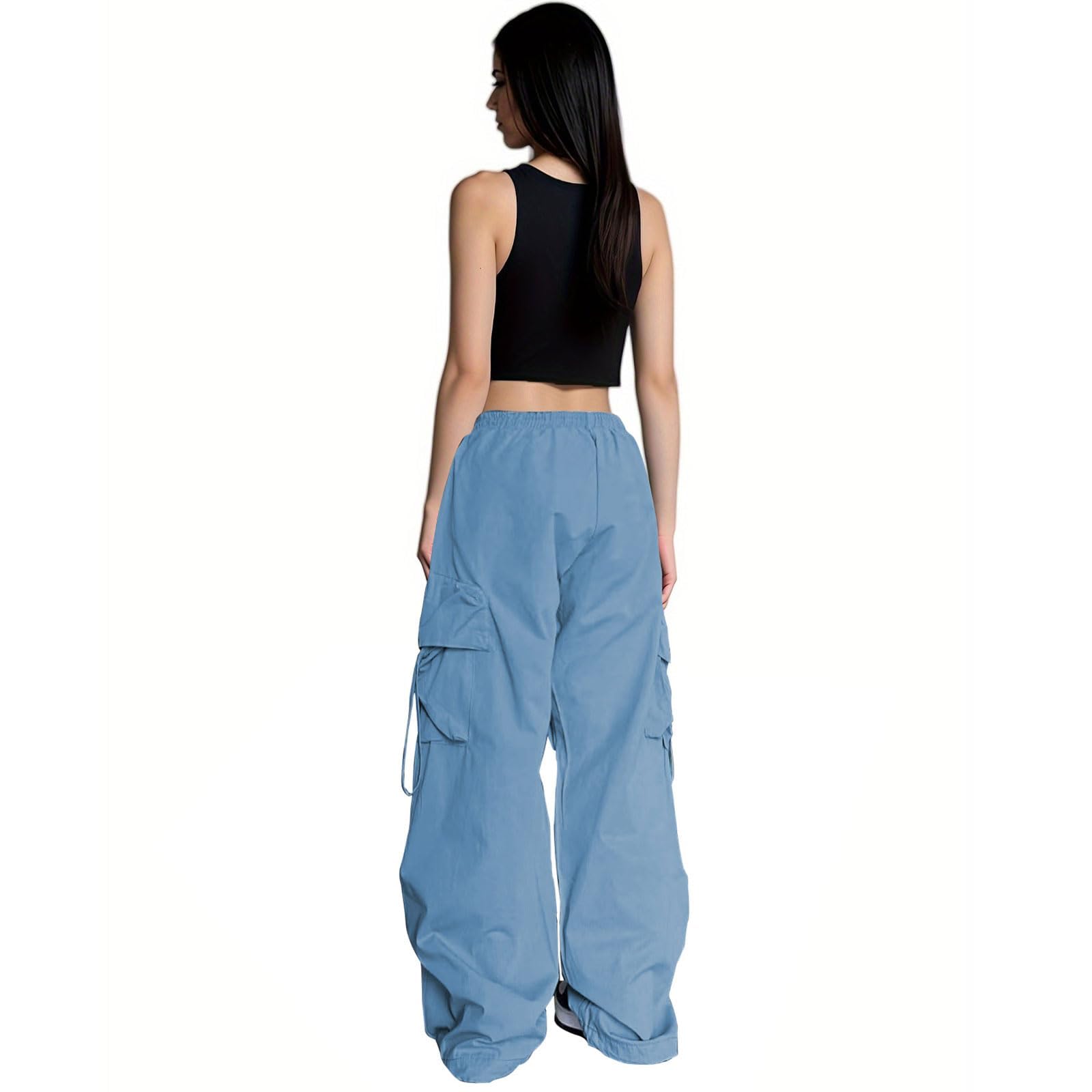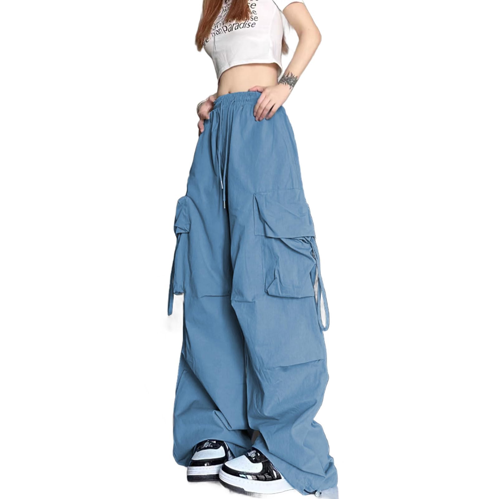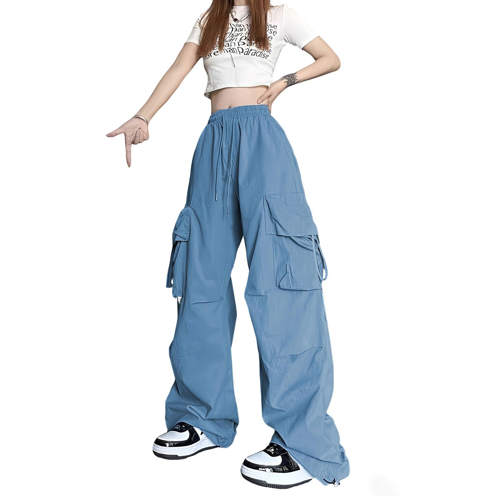Elastic waist cargo pants for women feature 4 pockets, elastic waist with drawstring, solid color and pleated design. The combination of Harajuku style and Y2K style parachute pants will make you instantly attract attention.