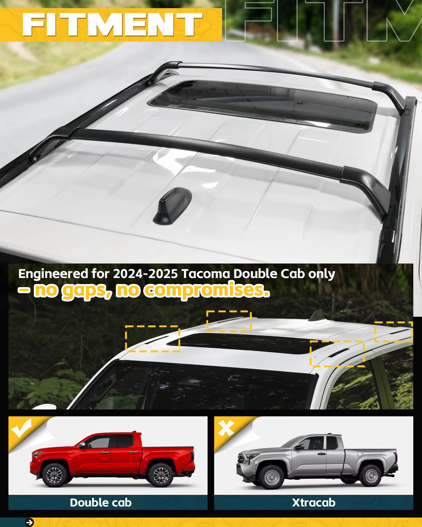 Perfect Fit: Trumgeta Roof Rack Cross Bars Specifically designed to fit for 2024 2025 2026+ 4th Gen Toyota Tacoma Double Cab.Includes SR/SR5/TRD Sport/TRD Off-Road/TRD Sport i-FORCE MAX/TRD Off-Road i-FORCE/Limited/Limited i-FORCE MAX/Trailhunter/TRD Pro. Not fit for SR Xtracab, SR5 Xtracab, TRD PreRunner