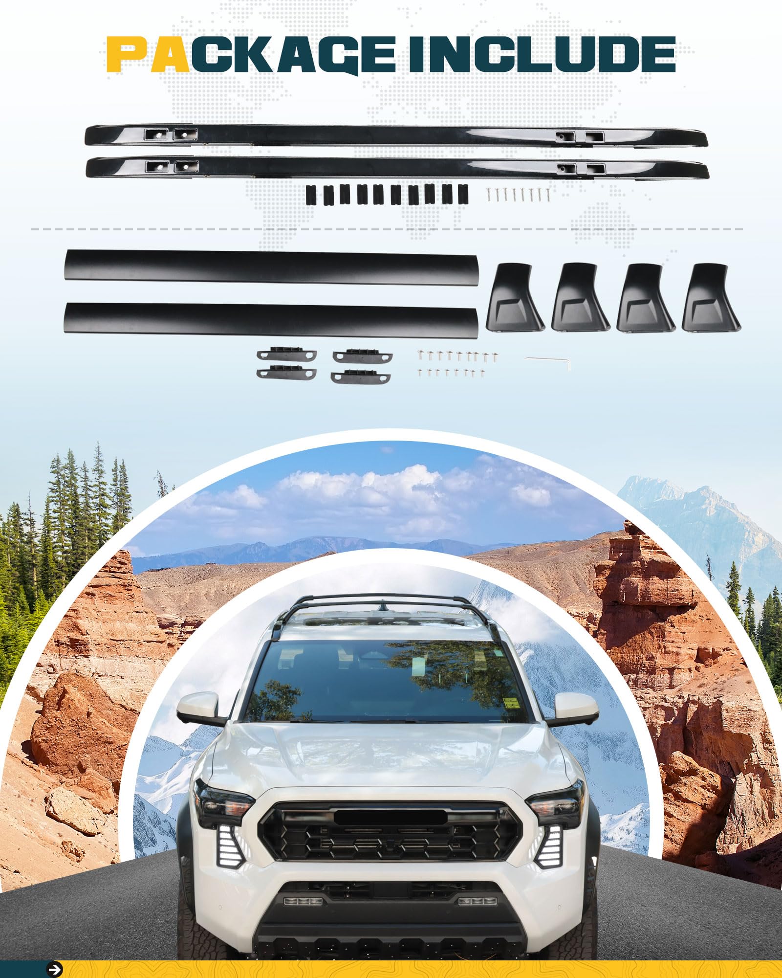 Package Including: 2pcs black cross bars and 2pcs black roof rack rails with hardware fit for 2024 2025 toyota tacoma