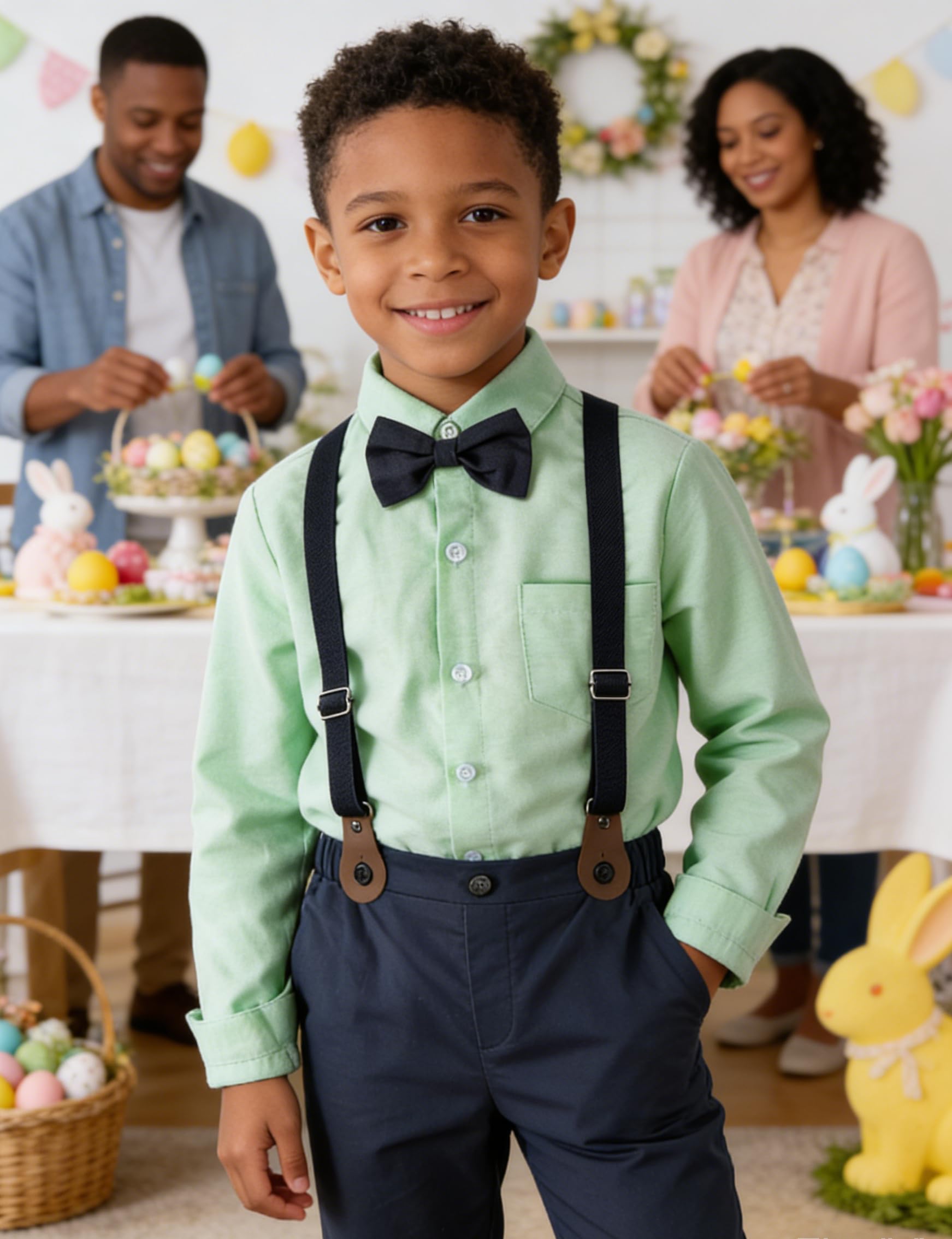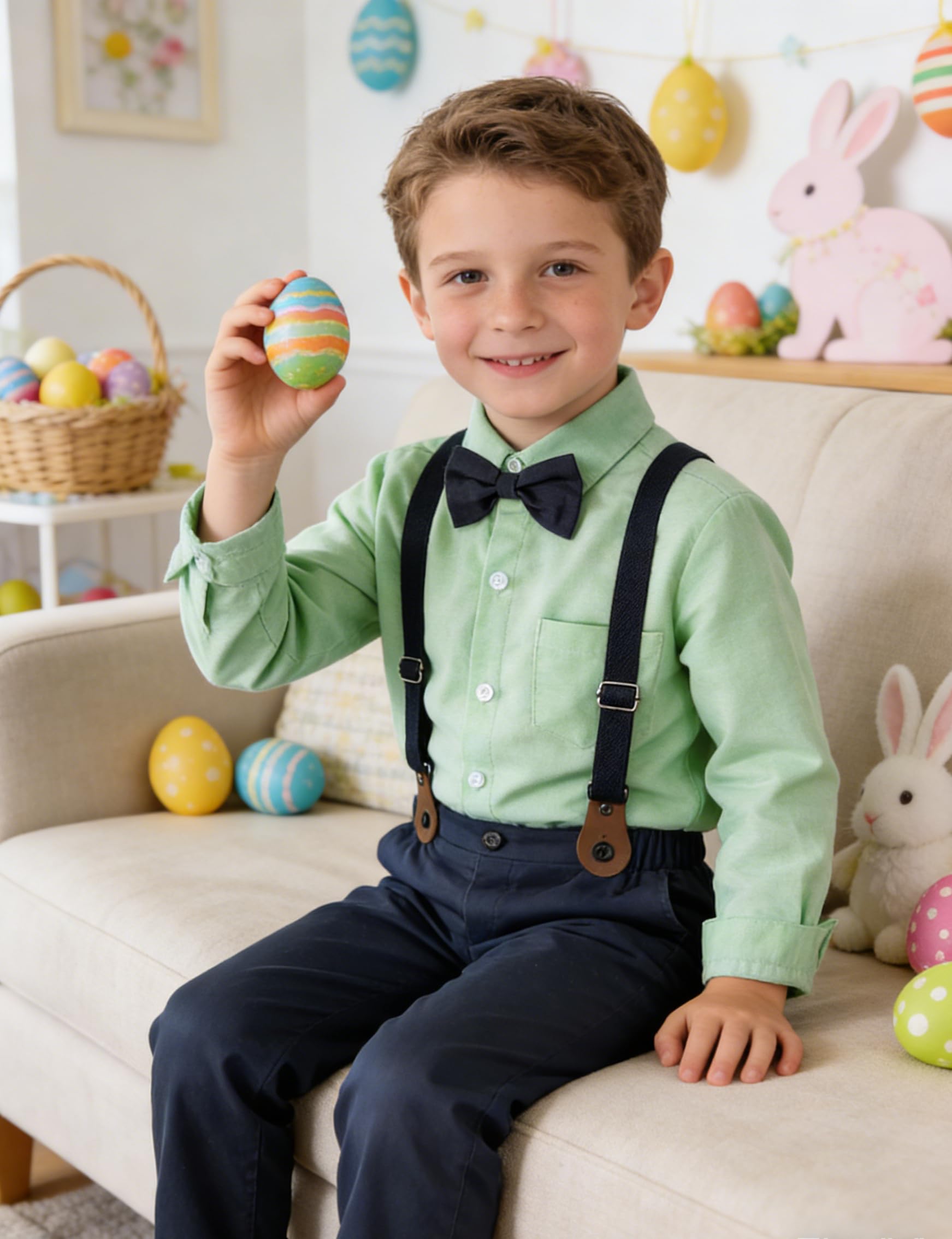 Toddler boy dress outfit consists of long sleeve dress shirt, elastic-waist pants, detachable bow tie and stretch suspender.