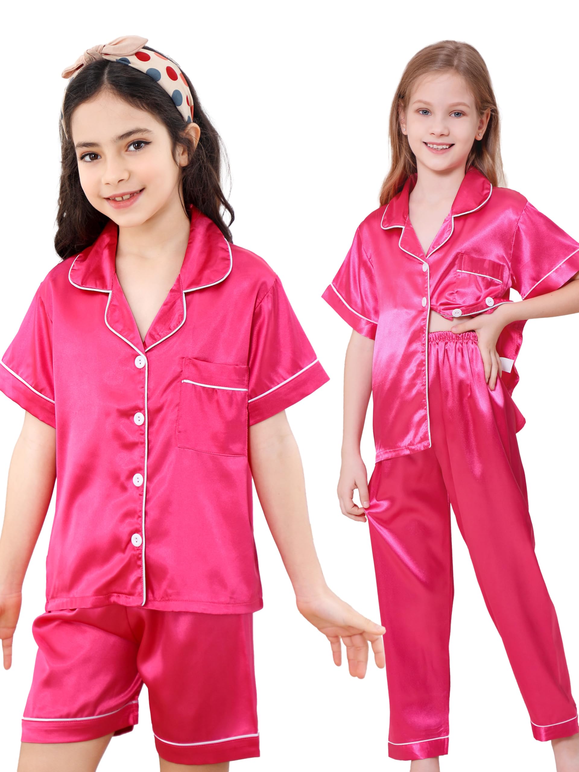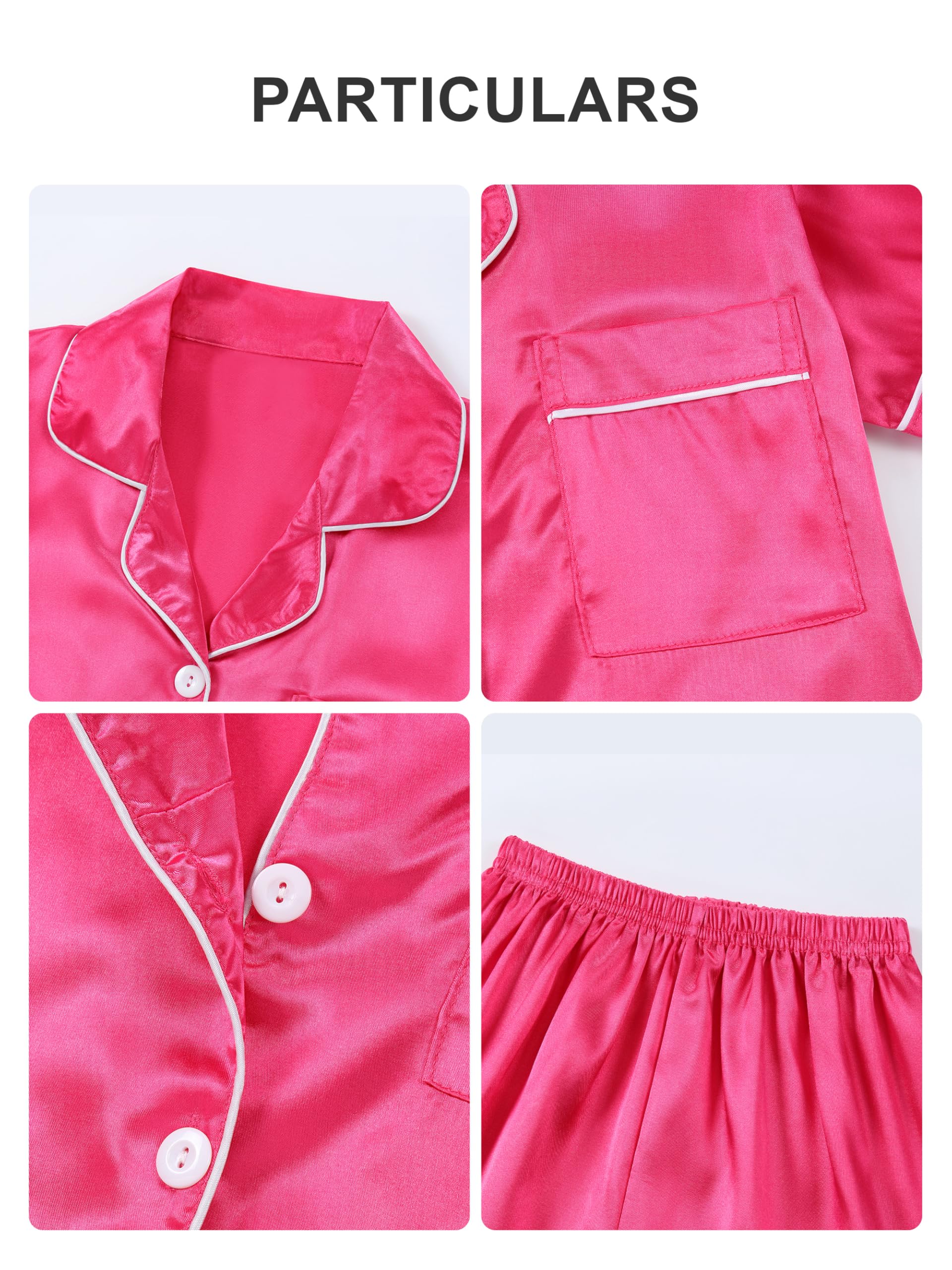 Three-piece pajama set: Crafted from soft satin-like material, this set includes a short-sleeved top, shorts, and pants for year-round comfort. The top features a lapel collar, front pocket, and button closure, while the shorts and pants have elastic waistbands for a snug fit. The silky fabric offers a luxurious feel, ensuring a cozy, restful night's sleep for your child.