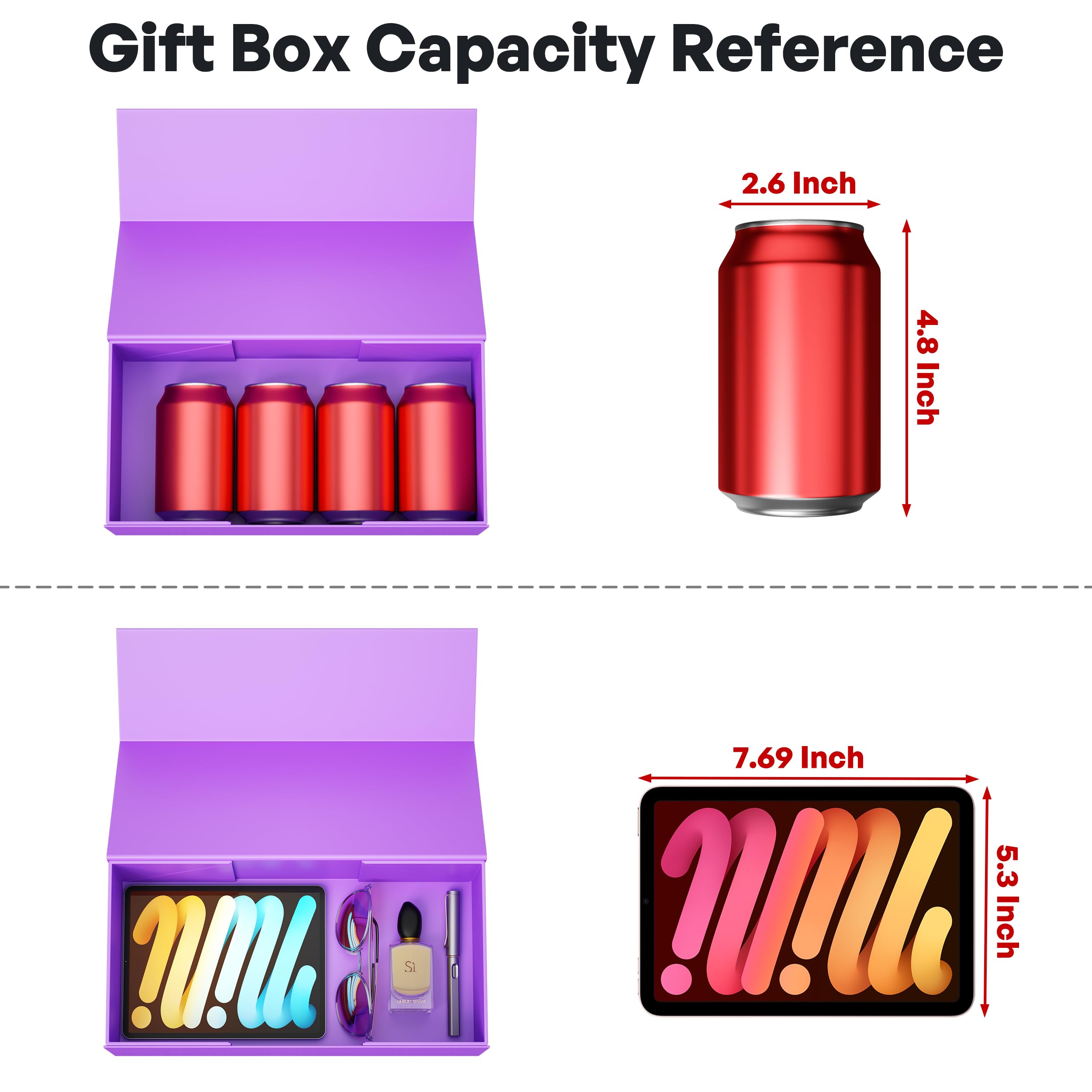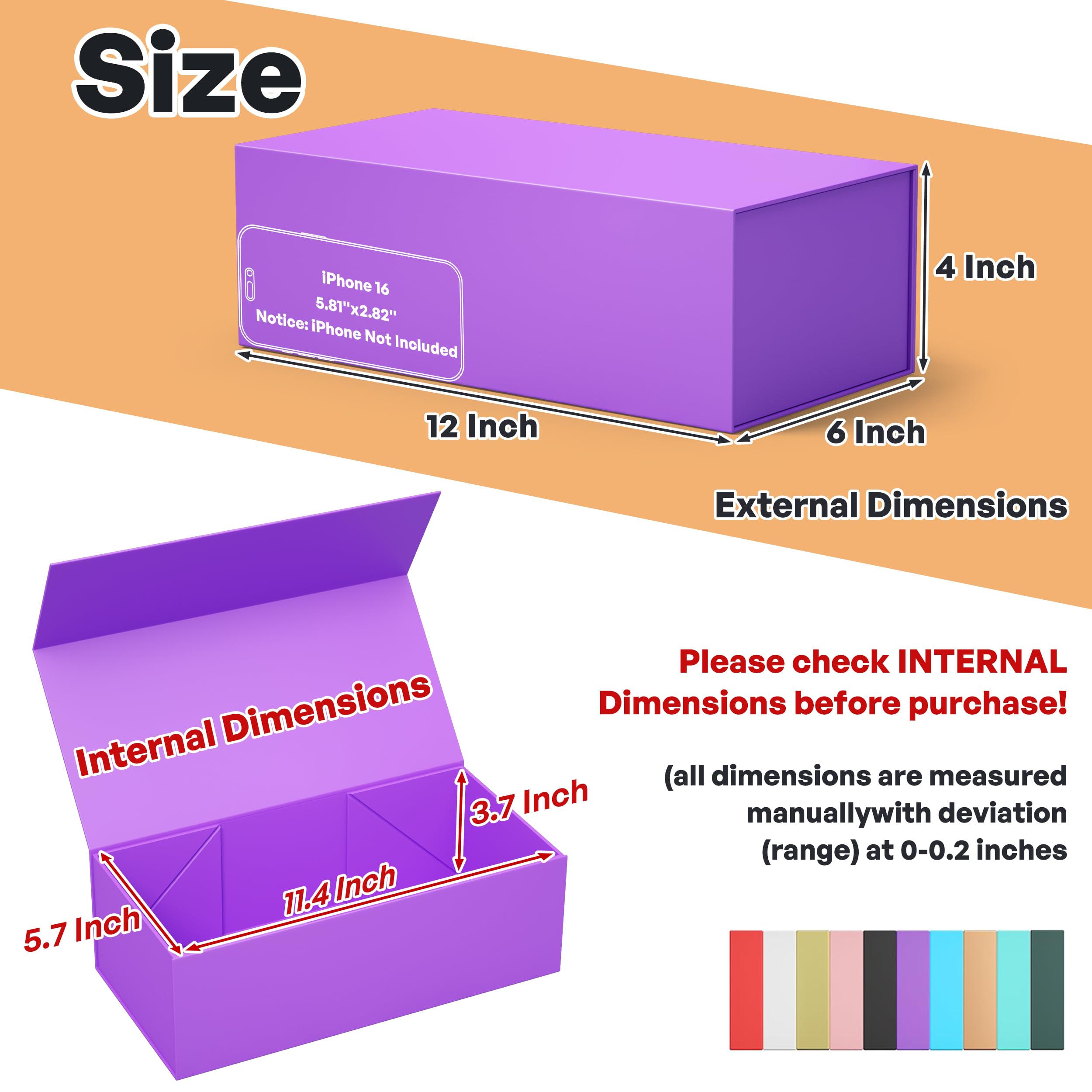 🎁SlZE - Gift boxes for presents External dimensiong 12x6x4 inches (Internaldimensions are 11.4x5.7x3.7 inches),Collapsible gift box can holdchocolates, candies, cosmetics, perfumes, jewelry, candles, cups, souvenirs orsmaller clothing accessories and more.(all dimensions are measured manuallywith deviation (range) at 0-0.2 inches)