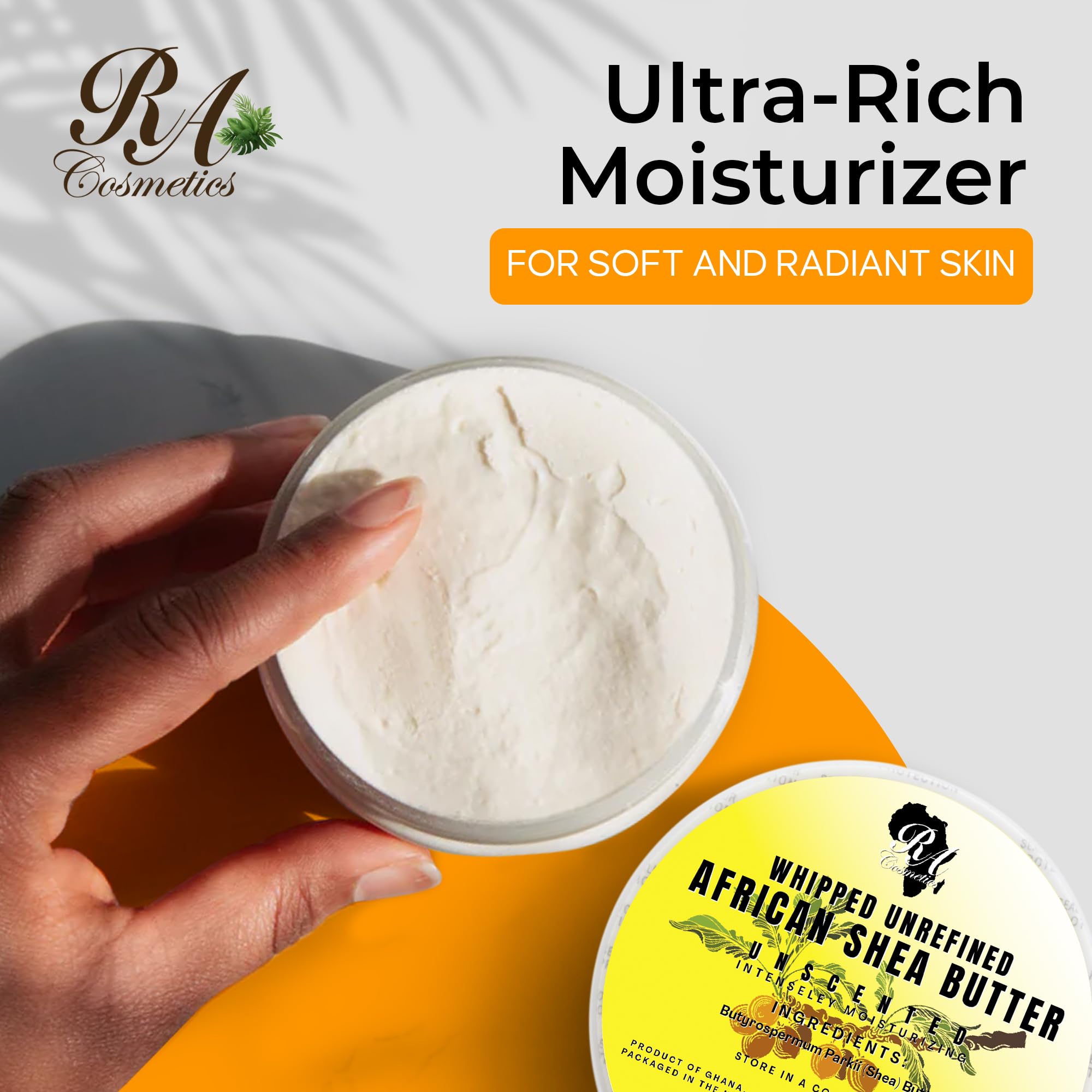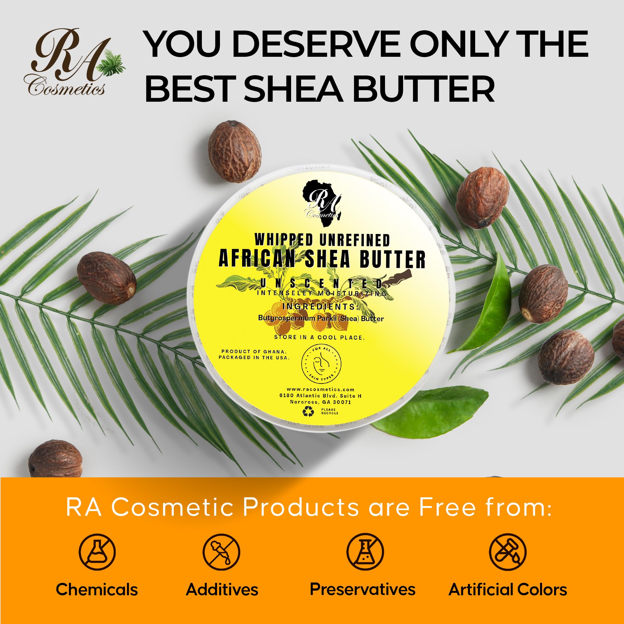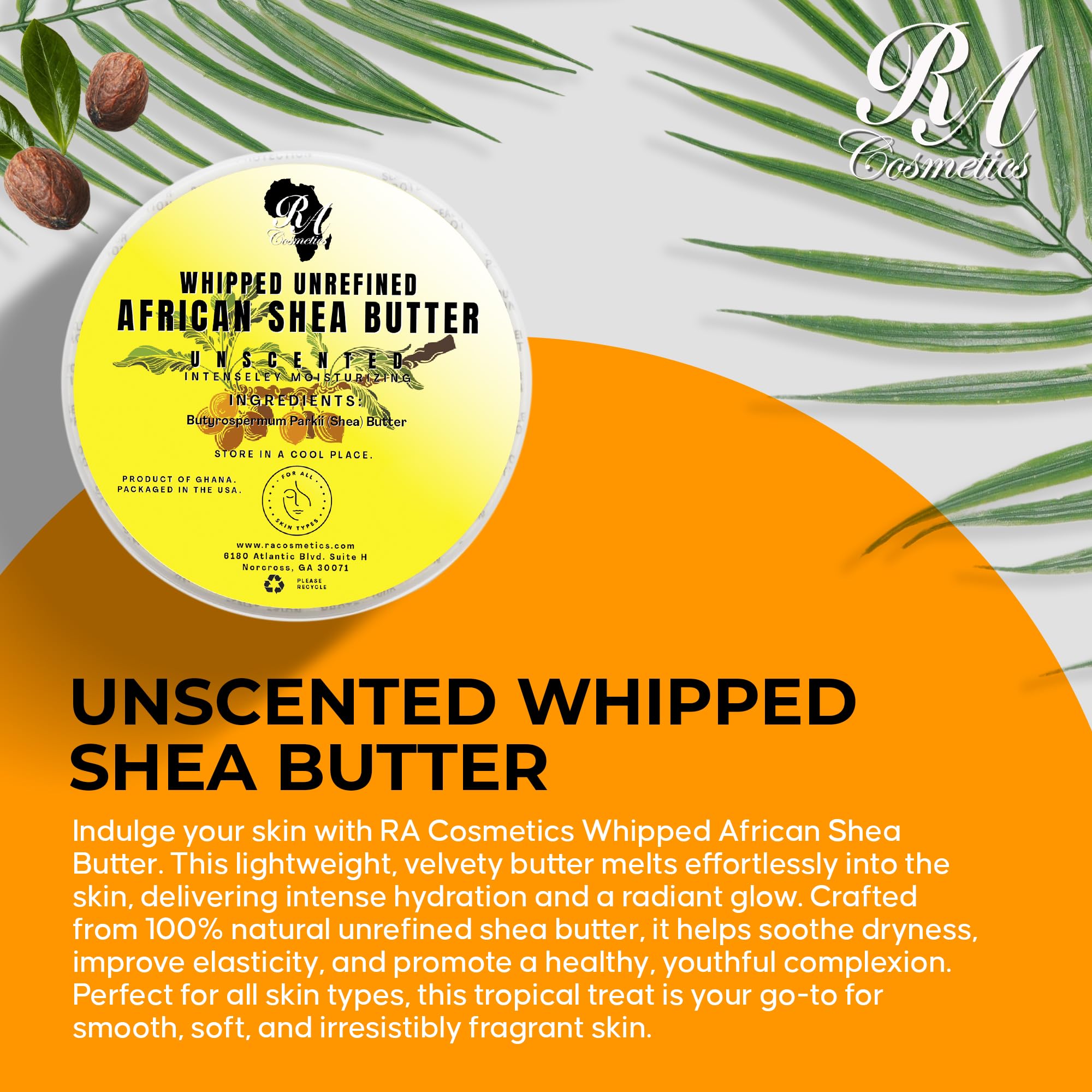 Unscented Luxury: Indulge in the pure luxury of unscented shea butter. Free from artificial fragrances, RA Cosmetics ensures that you experience the true, natural essence of shea butter, making it perfect for those who prefer a fragrance-free option.