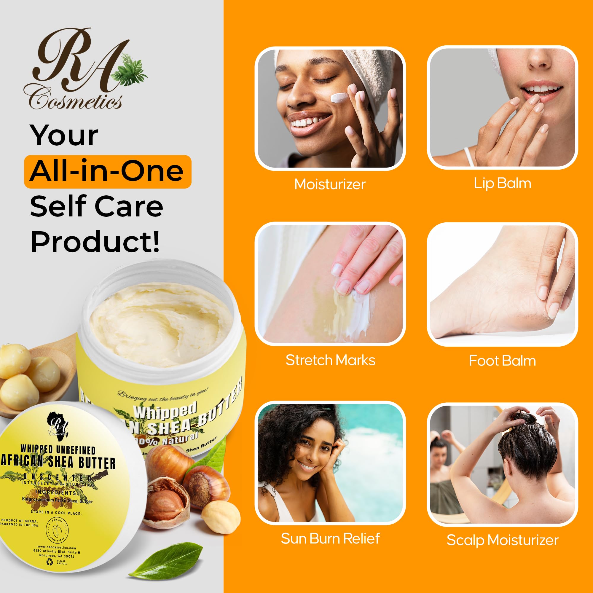 Premium Whipped Shea Body Butter: Enjoy the luxurious feel of African Shea Butter, expertly handcrafted in Ghana, West Africa. Our whipped shea butter, enriched with vitamin E and F, creates a protective moisture barrier, pampering your skin from head to toe for an ultimate moisturizing experience.