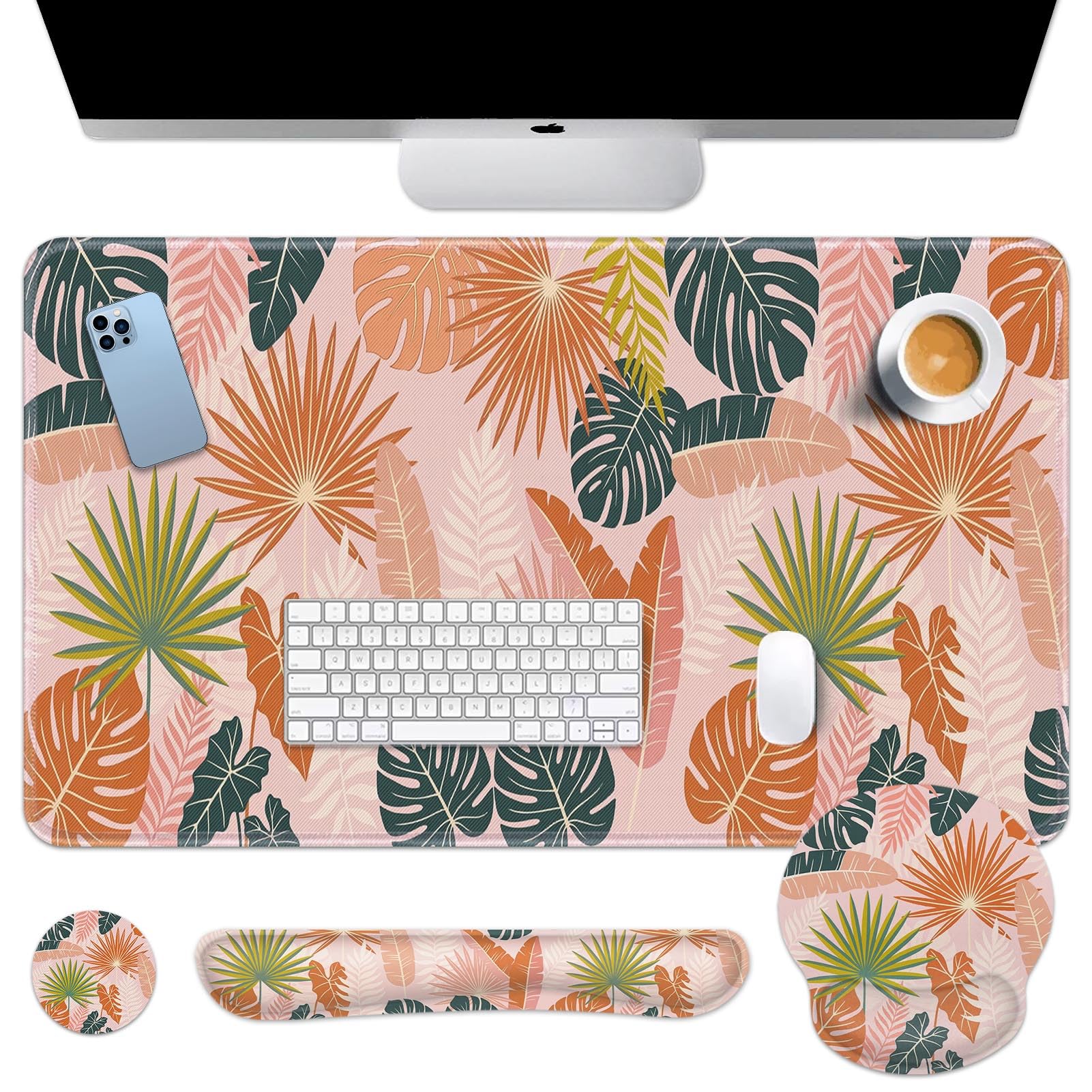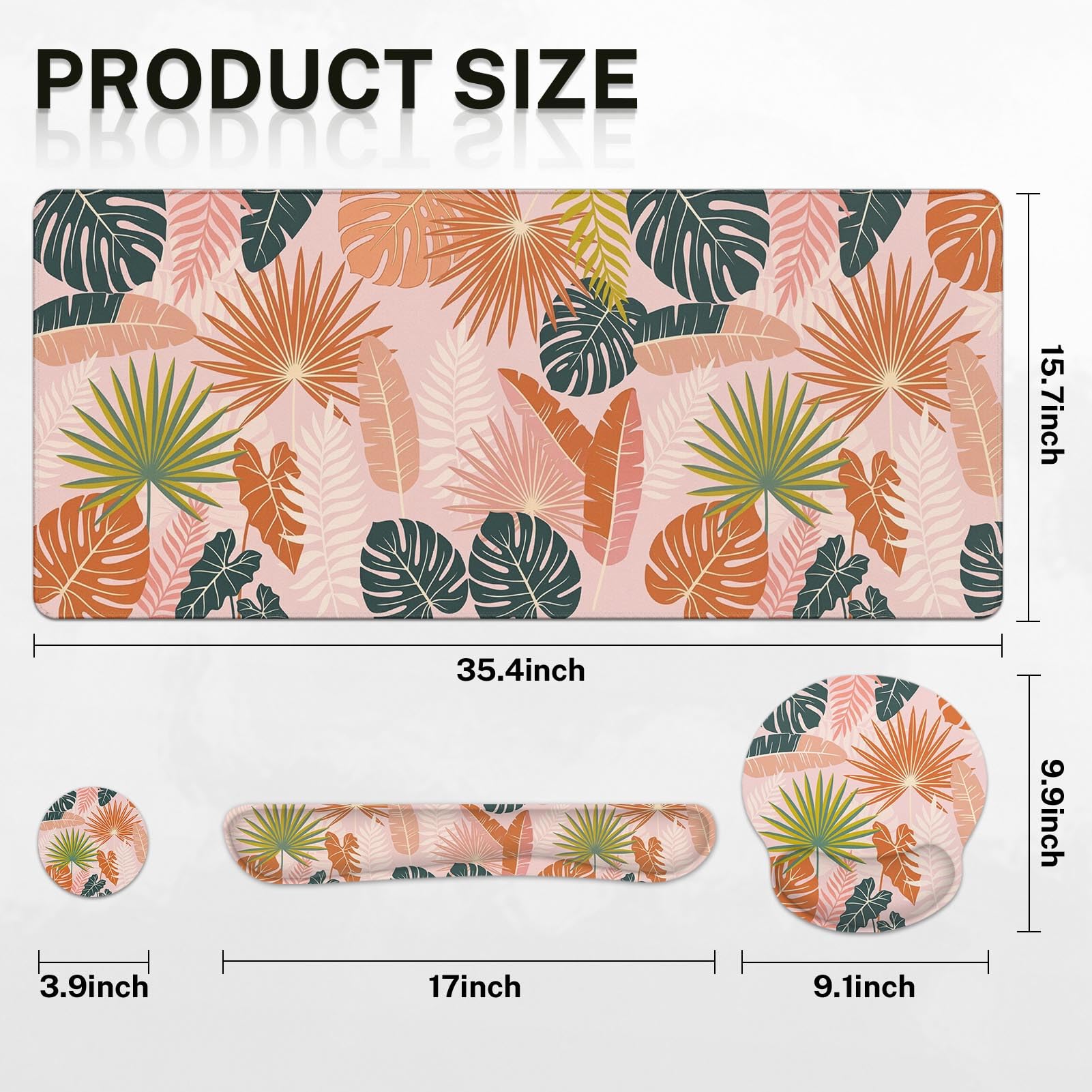 Comprehensive 4-in-1 Mouse Pad Set:This all-inclusive mouse pad set offers a large desk pad (35.4x15.7inch),a keyboard wrist rest (16.9x3.3inch),a mouse wrist rest (9.8x9.1inch),and a cup coaster (3.9x3.9inch).All these accessories come together at an incredible value,saving you the hassle and expense of separate purchases.This spacious desk pad can accommodate your mouse,gaming keyboard,and other desk essentials,while maintaining aclean.