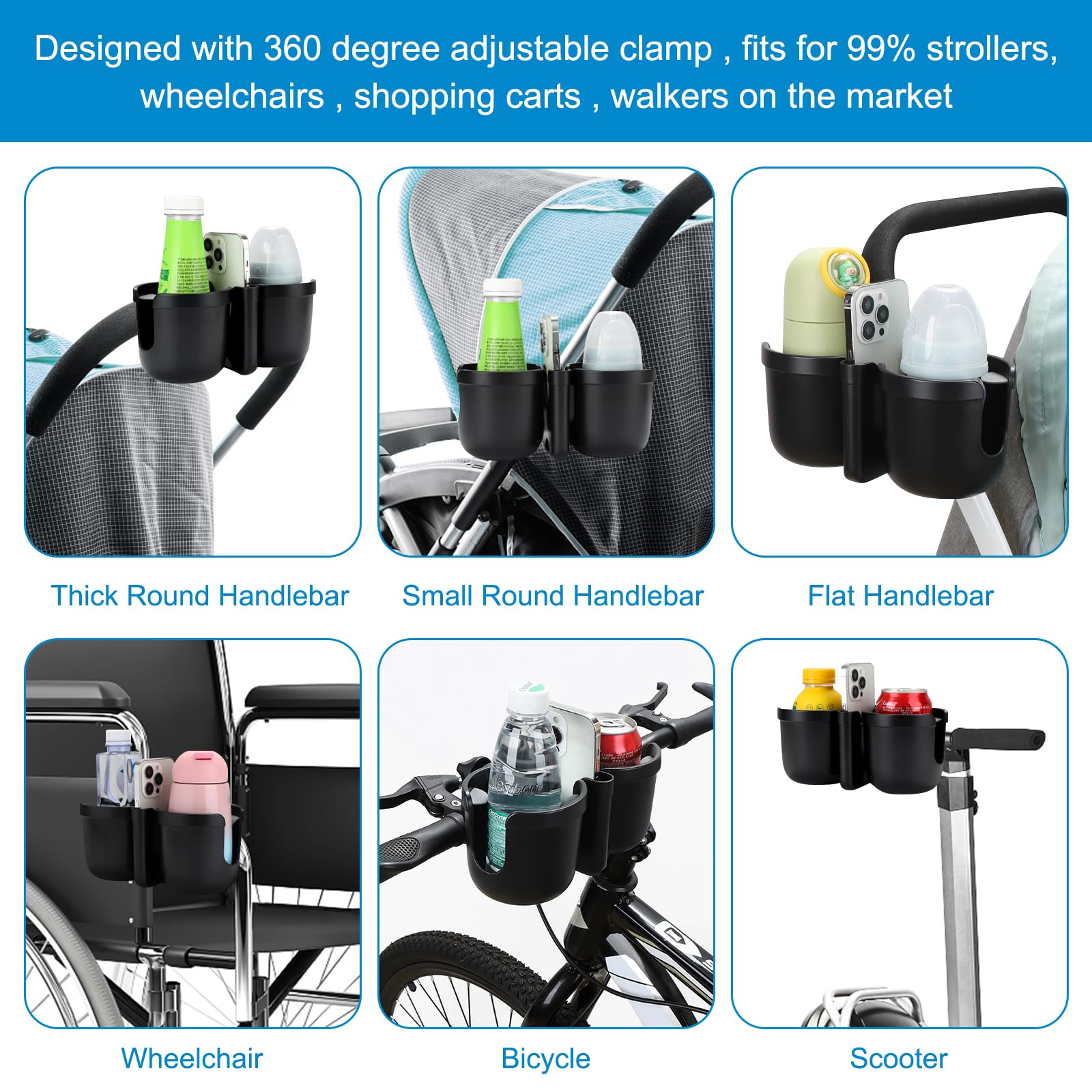 Wide Compatibility: This universal cup holder with phone holder compatible with most baby strollers, walker, wheelchair, rollator, bike, scooter, boat handle bar, shopping cart, kayak, ATV, lawnmowers, motorcycle, treadmill, golf push cart and so on.
