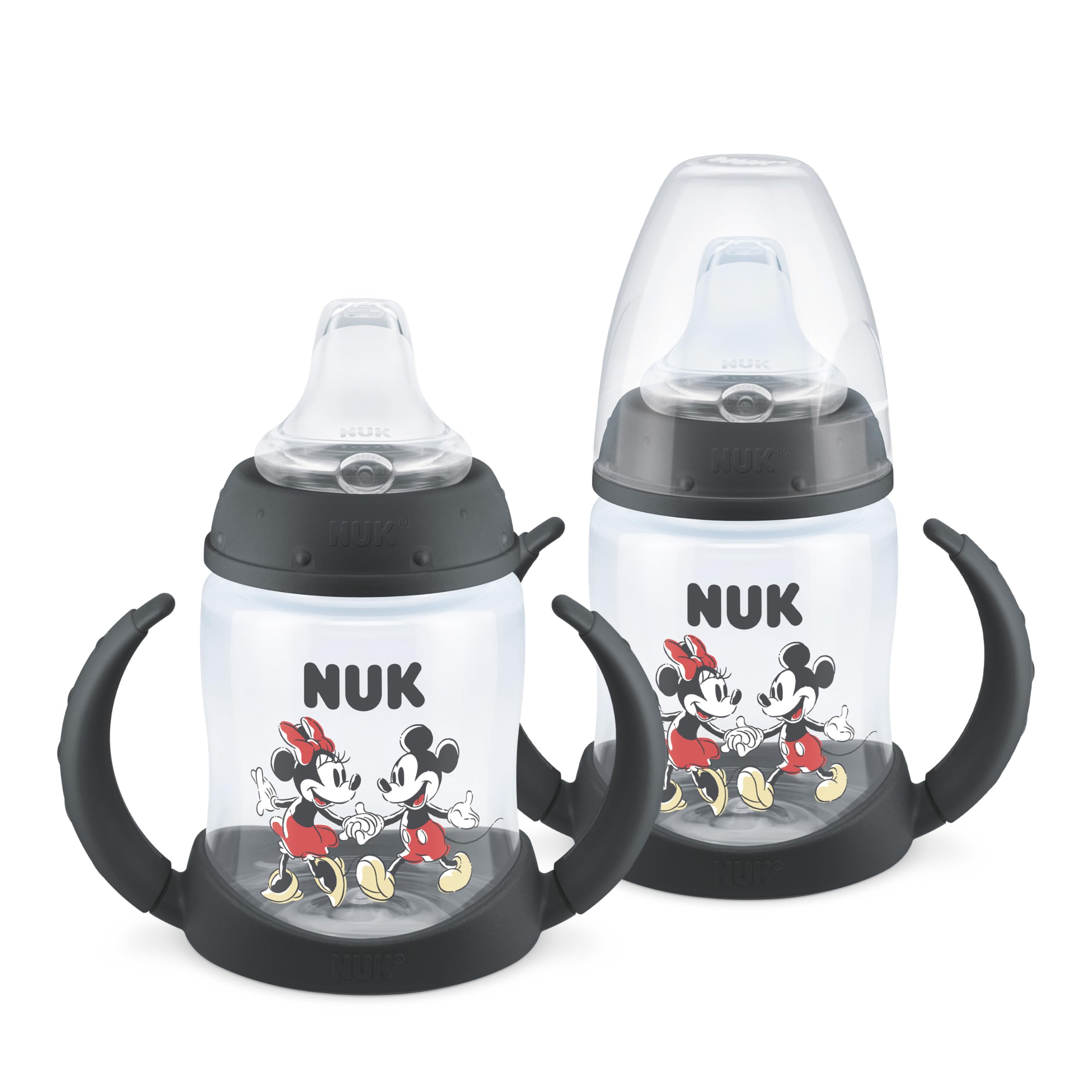 The NUK First Choice Mickey Mouse Learner Cup is designed for a smooth transition to baby's first cup. This Learner Cup features a spill and leak proof soft spout that is gentle on teeth and gums. And, the easy-grip, anti-slip removable handles are sized just right for your little one. NUK Learner Cups are BPA free and dishwasher safe. Recommended for ages 6 months and older.