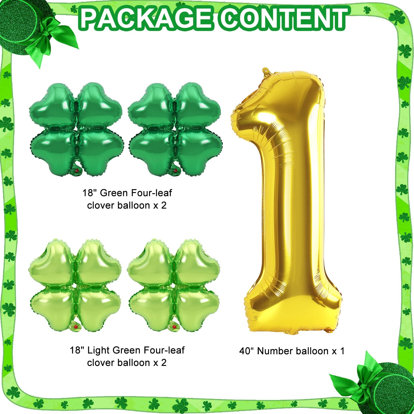 Complete Decoration Set - This package includes a giant 40-inch gold ONE balloon, 2 light green four-leaf clover balloon and 2 dark green four-leaf clover balloons. With a total of 5 balloons, it's everything you need for your little one's St. Patrick's Day 1st birthday bash.