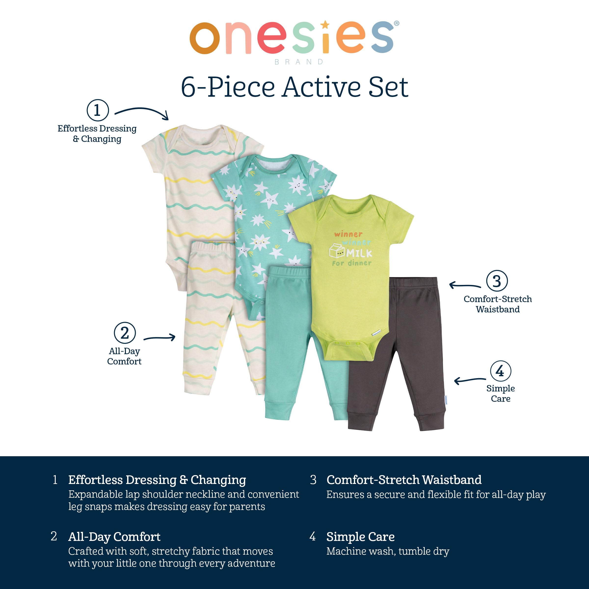 Includes 3 Onesies brand bodysuits with 3 matching pants