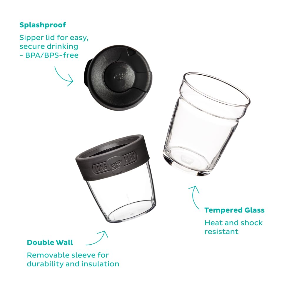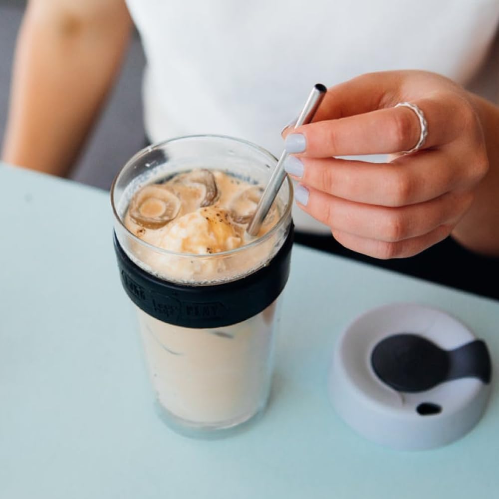Thoughtful design. Drafted cup for the perfect pour. Enjoy lid on or off. Insulated - keeps temperature and prevents condensation. Press on splashproof sipper lid. Made to Last. Double-walled tempered glass and clear sleeve. Enjoy look and taste.