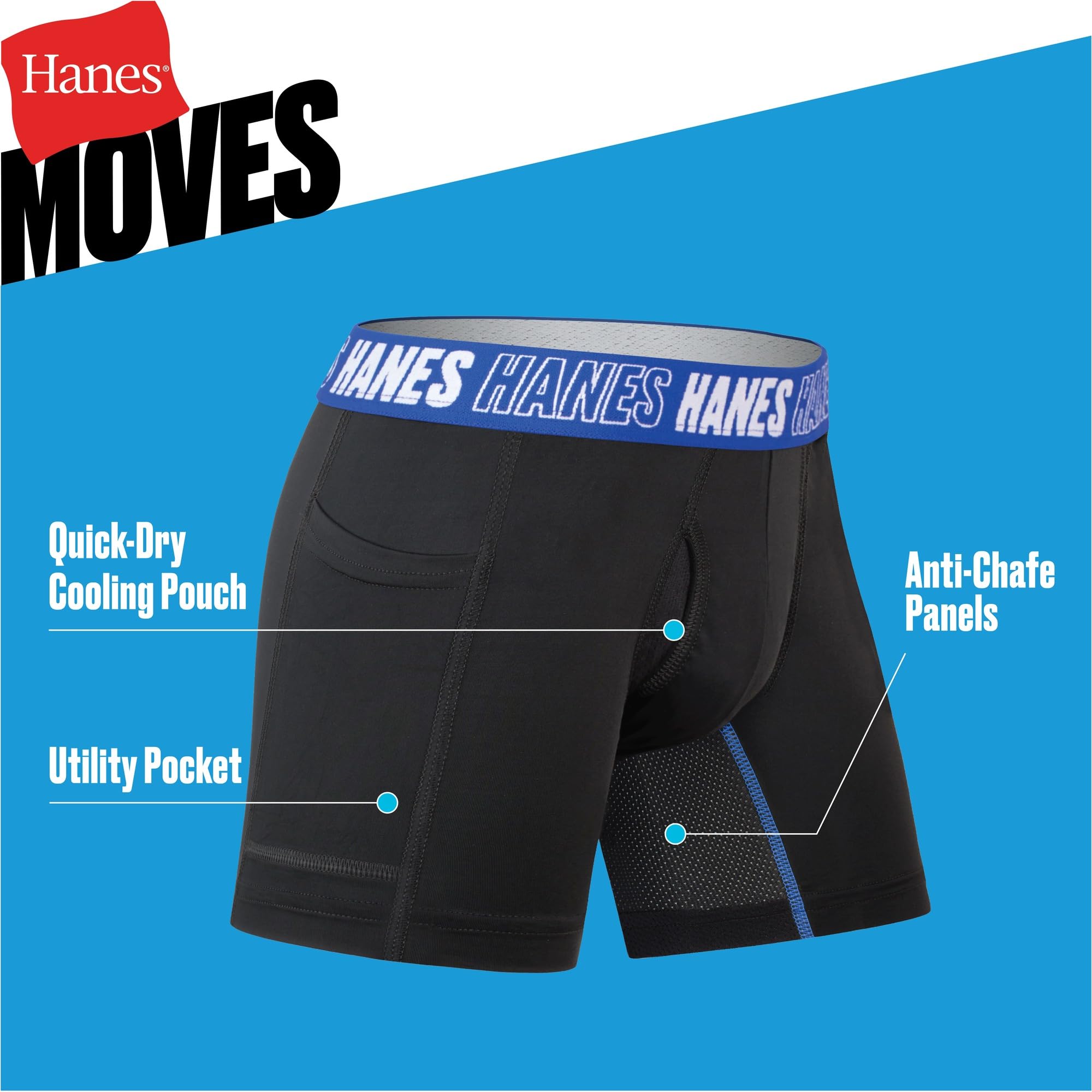 Description Featuring an anti-chafe gusset and a quick-drying pouch, lightweight Hanes Moves Boys' Long Leg Boxer Briefs provide the extra coverage he wants and the comfort he needs. Moisture-wicking fabric, odor control, and X-Temp technology match his energy level, teaming up to keep him feeling fresh and cool. He'll like the way the 4-way stretch fabric bends and flexes with him and will appreciate the handy utility pocket and smooth Tagless interior. This tween long leg boxer brief underwear is available in a convenient assorted 6-pack - because you can never have too much of a good thing. Hanes Moves. Everyday comfort and performance solutions for boys.